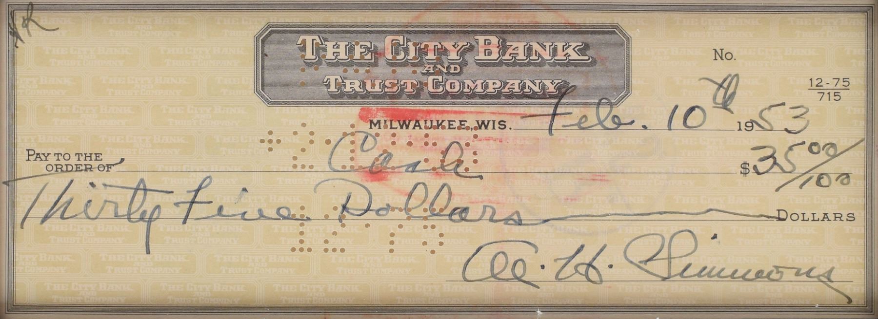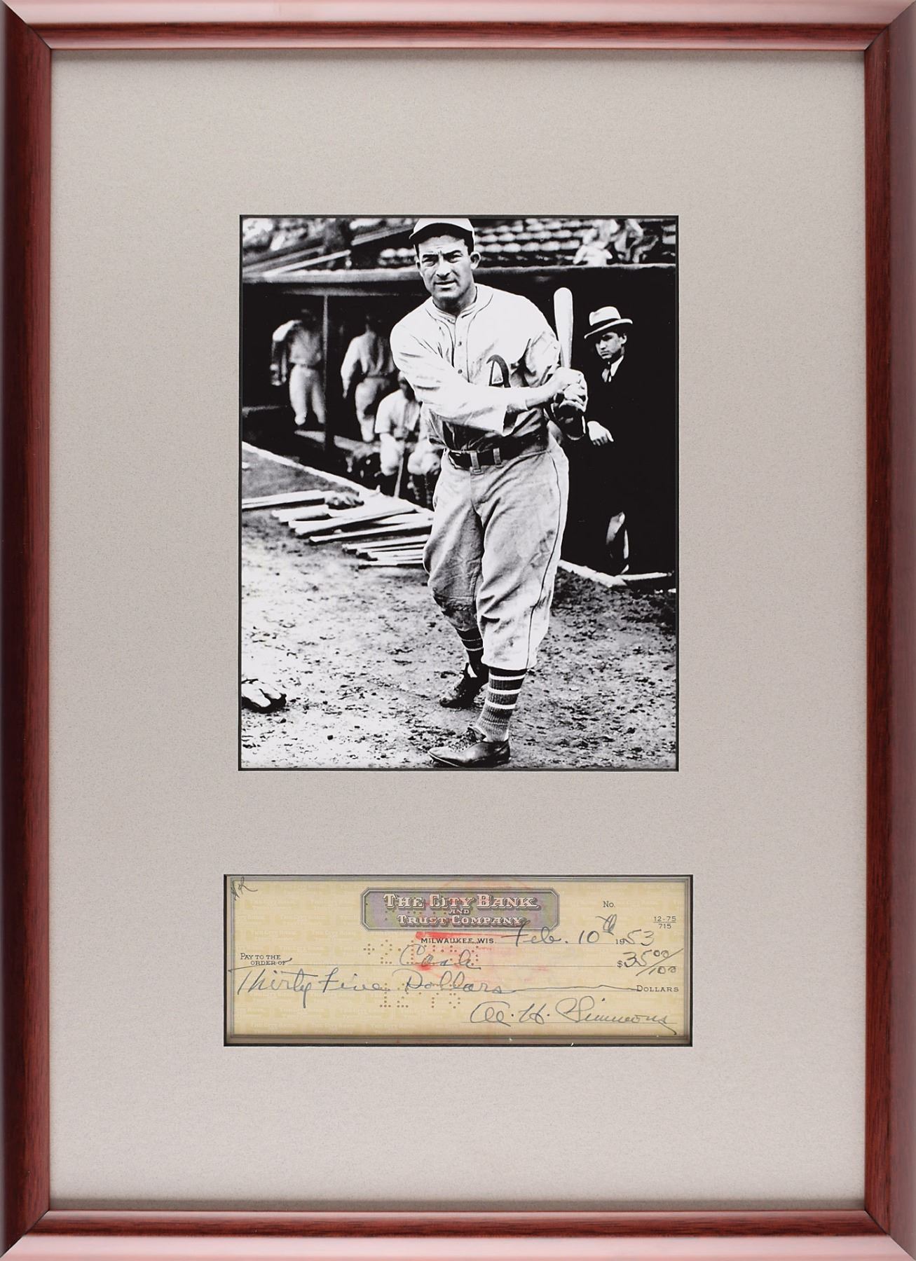 The City Bank and Trust Company of Milwaukee check, 8 x 2.75, filled out and signed by Simmons, "Al. H. Simmons," payable to "Cash" for $35, February 10, 1953. Matted and framed with a photo of Simmons to an overall size of 16 x 22. In fine condition.