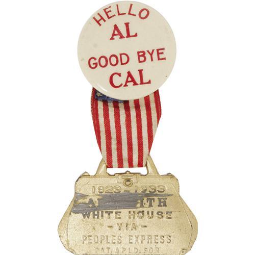 <B>Al Smith: "Hello Al, Good Bye Cal" with Attached Fob.</B></I> Very unusual 1¼" celluloid with a small edge scuff at 9:00, mentioned for accuracy, which does not detract from this most unusual button. Attached is a brass satchel with "1929-1933 Al Smith White via Peoples Express". There is a brass scuffing on Smith's name on the fob which only allows 'th' to be seen. Overall 3.25" in length.<BR><BR><b>Shipping:</b> Miscellaneous Collectibles, Smal (<a target="_blank" href="http://www.heritageauctions.com/common/shipping.php">view shipping information</a>)