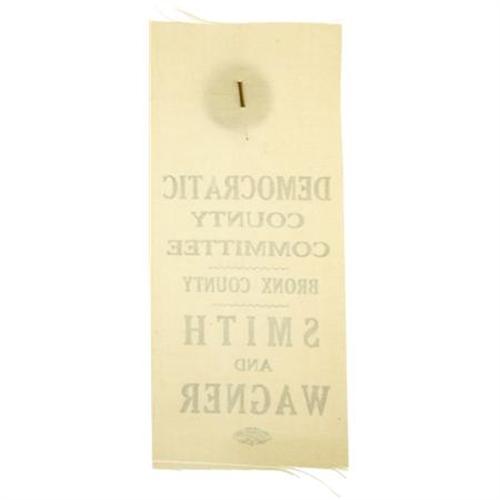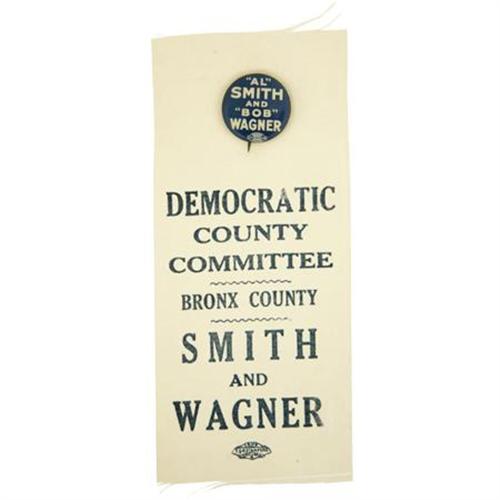 <B>Al Smith and Senator Robert Wagner Coattails Campaign Ribbon and Button, </B></I>5 1/2”, “Democratic County Committee, Bronx County”. Pristine. <B></B></I><BR><BR><b>Shipping:</b> Miscellaneous Collectibles, Smal (<a target="_blank" href="http://www.heritageauctions.com/common/shipping.php">view shipping information</a>)