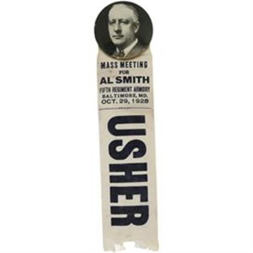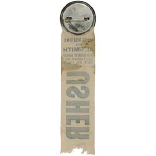 <B>Al Smith: Scarce Baltimore, Maryland Meeting.</B></I> A 2 1/8" button featuring a bold picture of Al Smith with an attached ribbon from a Mass Meeting in Baltimore. For accuracy, some very, very light edge foxing at 6:00, otherwise choice condition.<BR><BR><b>Shipping:</b> Miscellaneous Collectibles, Smal (<a target="_blank" href="http://www.heritageauctions.com/common/shipping.php">view shipping information</a>)