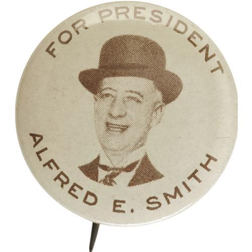 <B>Al Smith: A Unique 1¼" Design Showing Smith Wearing His Trademark Brown Derby.</B></I> While a number of Smith campaign items trade on the brown derby theme, this is the only variety that actually pictures Smith wearing it. The same manufacturer also produced a jugate and a Hoover mate in similar style. All are rare and also prone to condition problems. The present copy is choice and beautifully centered, probably an un-improvable example.<BR><BR><b>Shipping:</b> Miscellaneous Collectibles, Smal (<a target="_blank" href="http://www.heritageauctions.com/common/shipping.php">view shipping information</a>)