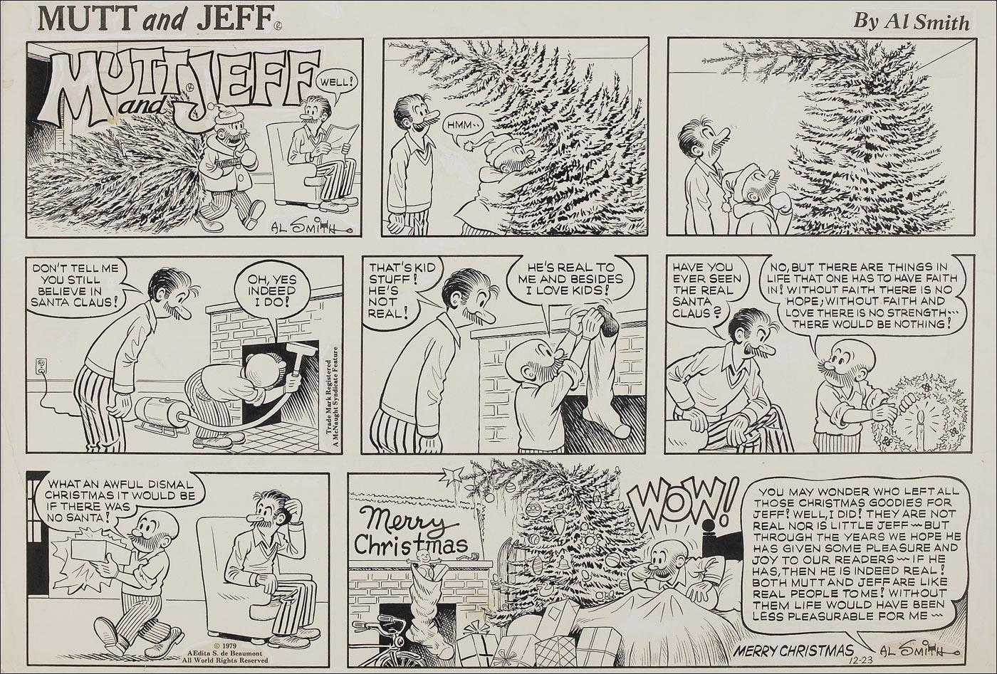 Original hand-inked 8-panel Mutt and Jeff Sunday comic, dated December 23, 1979, on a 20.5 x 13.75 sheet of off-white artist’s cardstock. Strip depicts the characters discussing the wonders of faith, hope, and Christmas magic. Signed in the last panel in black ink by Smith. In very good condition, with scattered creasing and soiling.