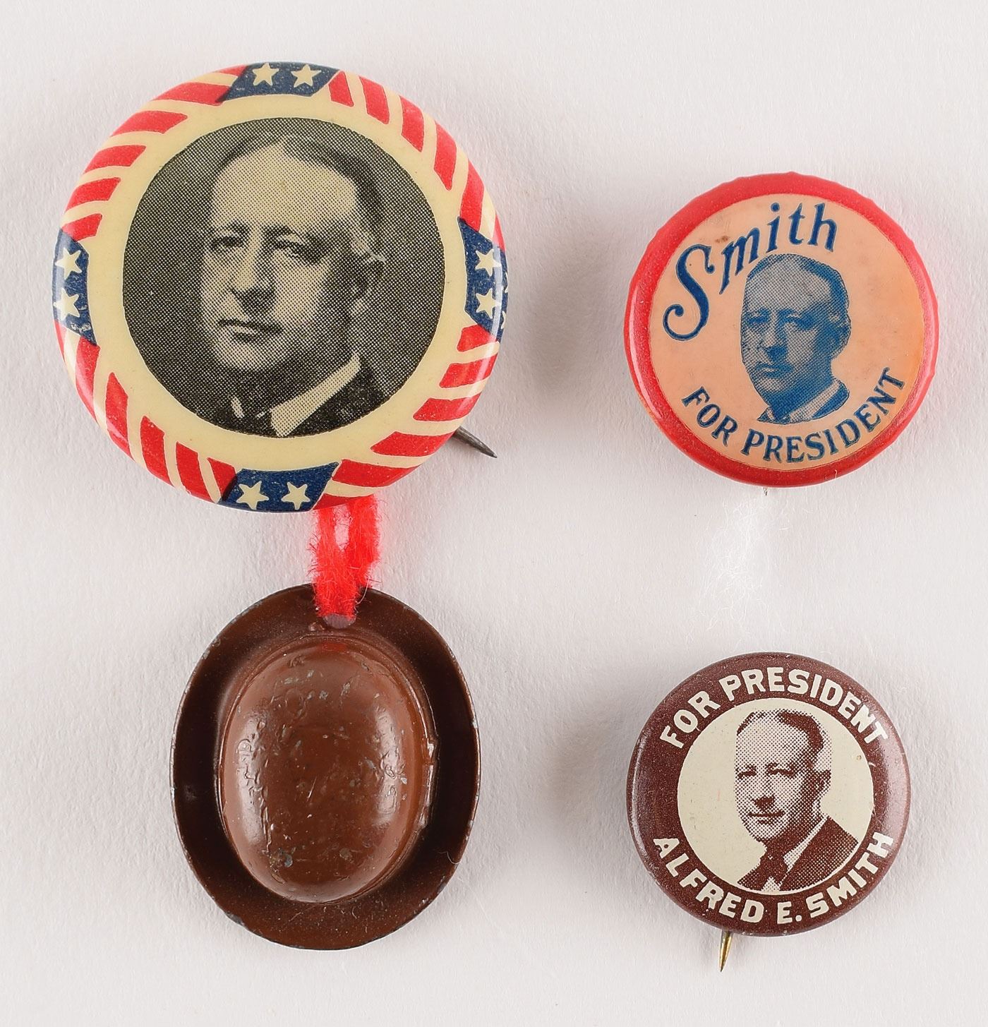 Three pins from Al Smith's 1928 presidential campaign, measuring between 3/4? and 1 1/4?, including two different "For President" portrait pins, and one patriotic portrait pin with dangling three-dimensional hat. In overall fine condition. Smith was well-known for wearing a brown derby hat, which became one of the defining images of his electoral campaign.