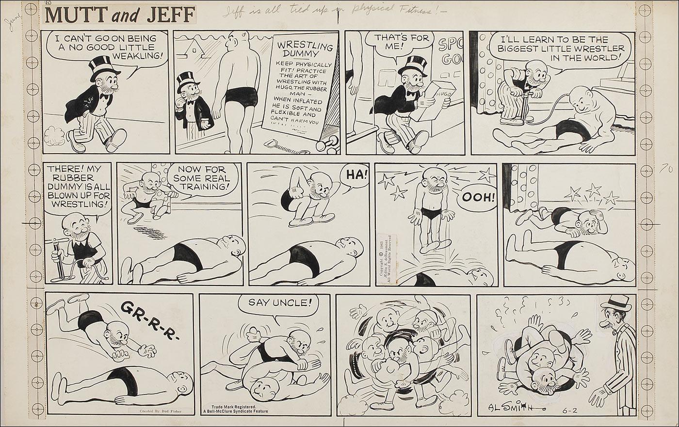Original hand-inked 13-panel Mutt and Jeff Sunday comic, dated June 2, 1963, on a 22 x 14 sheet of off-white artist’s cardstock. Strip depicts Jeff training with a wrestling dummy and somehow coming out on the losing end. Signed in the last panel in black ink by Smith. Pencil notation to top border in an unknown hand reads, “Jeff is all tied up in physical fitness.” In very good condition, with scattered toning and soiling.