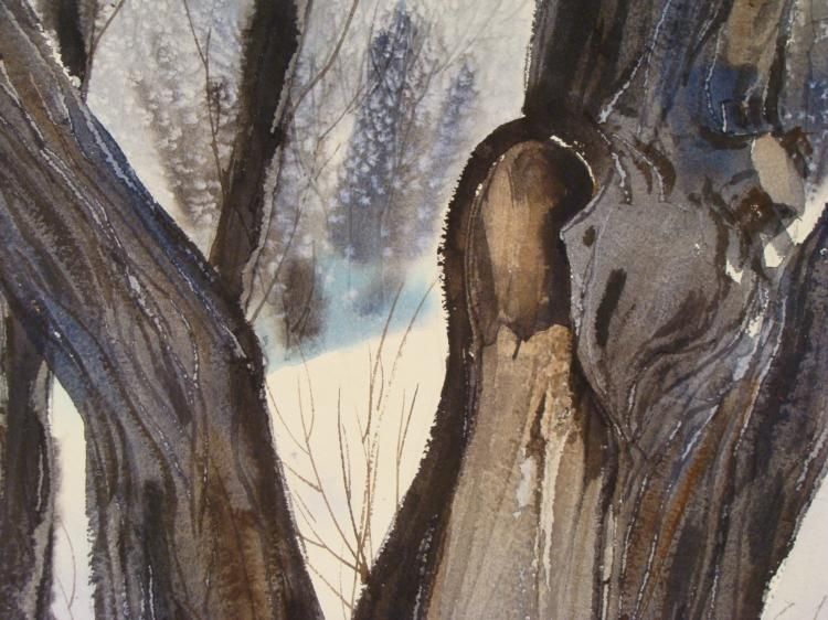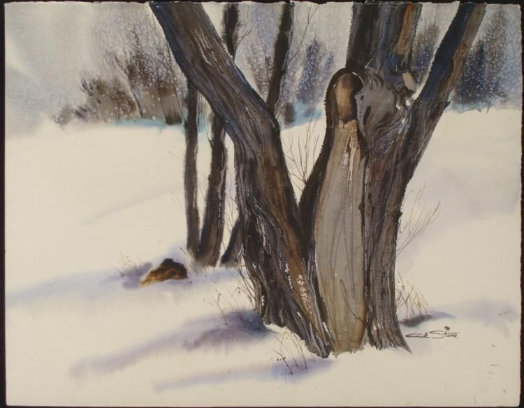 This is an original painting of a tree in the wintertime, focusing on a close view of the weathered old trunk, still standing firm in the snow. * * Artist: Al StineSignature: In paint, lower right * Medium: Watercolor on heavy paper, with some deckled edgesSize: 28 1/2 x 22 inches Condition: Excellent; some marks at the lower right cornerBiography: * Al Stine graduated from The Art Institute of Chicago, and then began working as a freelance illustrator. His work became recognized in the art community, and he got involved in several arts organizations, including president of the Artist Guild of Chicago. He has exhibited widely, and published several how-to books on art techniques. His art can be found in galleries across the country. *