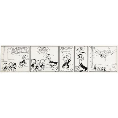 <B>Al Taliaferro - Donald Duck Daily Comic Strip Original Art (King Features Syndicate, circa 1940).</B></I> Huey, Dewey, and Louie leave their Uncle Donald hanging in this suspenseful Sunday, dated 12-3 (year unidentified, although notes indicate this strip may be from 1940). The art has an image area of approximately 21" x 4.5", and the condition is Excellent.