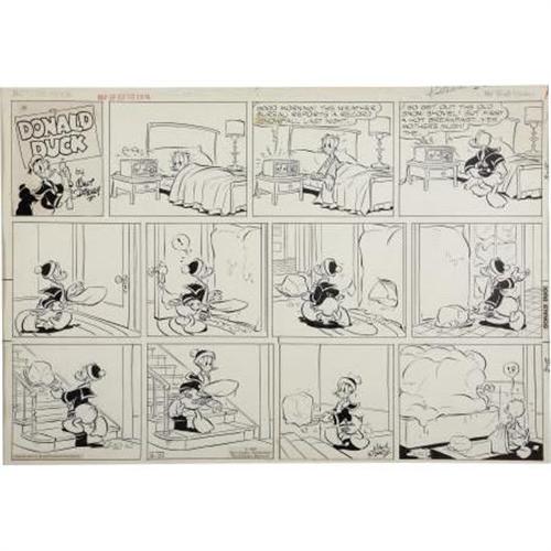 <B>Al Taliaferro - Donald Duck Sunday Comic Strip Original Art, dated 3-15-59 (King Features Syndicate, 1959).</B></I> Donald Duck stars in every panel of this Al Taliaferro Sunday from the fifties. Many fans regard Taliaferro as a top "Duck artist," on a par with Carl Barks. The key to Taliaferro's popularity is a funny gag, always finely staged, and this knee-slapper is no exception. The image area of this episode measures 20" x 14.5", and aside from a pasted-on art correction in the next-to-last panel, the art is in Excellent condition. <BR><BR><b>Shipping:</b> Requires 3rd Party Shipping (<a target="_blank" href="http://www.heritageauctions.com/common/shipping.php">view shipping information</a>)