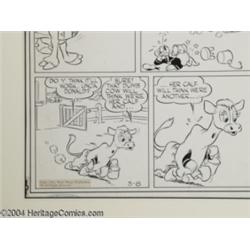 <B>Al Taliaferro - Donald Duck Sunday Comic Strip Original Art, dated 3-8-42 (King Features Syndicate, 1942).</B></I> Nothing is quite as sweet as mother's milk, and so, Donald Duck has little luck in weaning a calf off its mother's bosom. Al Taliaferro details this side-splitting battle of wills. In the end, Donald doesn't get any any cow's milk -- rather, he gets creamed -- by the calf! The image area of the Sunday measures 24" x 16", and the art is in Excellent condition. This early Sunday hails from within four years of the strip's start, so bid with gusto! <BR><BR><B>Important notice:</B> Heritage usually auctions material at the rate of 200-250 lots per hour. On some occasions eBay Live bid software or the Internet may not be able to keep up with the pace of the auction. We recommend placing a realistic absentee bid now as insurance to avoid disappointment. Occasionally the auctioneer may eliminate or reject an eBay Live bid, and the auctioneer may also reopen a lot after the close of the eBay live bidding (usually because we missed an audience bid), and may reject your bid even if it shows you as the winning bidder. By bidding via eBay Live, you agree that Heritage may award the lot to another bidder at its sole discretion under the circumstances described above or any other reasonable circumstances. Since eBay bids are not shown to us until we open the lot on the floor, we treat those bids just like floor bids. In most cases the floor responds before the eBay bid is presented to us, due to Internet lag time, so for consistency we have made it a policy that floor bids are always considered first over tie eBay live bids. Also please note that all Heritage lots purchased through eBay Live carry a 20% Buyer's Premium. Please make sure you read the Terms and Conditions before you bid.