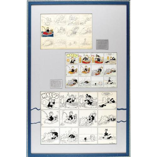 <B>Al Taliaferro - Waldo Tryout Sunday Comic Strip Original Art (circa mid-1930s).</B></I> Al Taliaferro is best known for his long stint as the artist for the <I>Donald Duck</B></I> daily and Sunday newspaper comic strips, but did you know he had another character waiting in the wings? <I>Waldo</B></I> was Taliaferro's "everyman", who, in this trial installment, goes fishing with his cat, Inadore. This concept is presented in three stages; stage one is the original penciled layout, drawn to size (14.5" x 9.75") on vellum. Note one panel has been colored in. Al refined the art in stage two, the finished ink on board art measuring 20.5" x 15". The art is now very similar to Taliaferro's work on <I>Donald Duck</B></I>, with very little dialog, and animation-style pantomime action -- in fact, he could have easily substituted Donald for Waldo, and submitted this as a Disney strip! Finally, in stage three, Taliaferro has colored a stat of the finished art, reduced to publication size. These rare items came to Bruce Hamilton directly from the Taliaferro estate, and have been professionally matted together and framed to an overall size of 29.75" x 45.25". <I>From the Estate of Bruce Hamilton.</B></I> <BR><BR><B>Important notice:</B> Heritage usually auctions material at the rate of 200-250 lots per hour. On some occasions eBay Live bid software or the Internet may not be able to keep up with the pace of the auction. We recommend placing a realistic absentee bid now as insurance to avoid disappointment. Occasionally the auctioneer may eliminate or reject an eBay Live bid, and the auctioneer may also reopen a lot after the close of the eBay live bidding (usually because we missed an audience bid), and may reject your bid even if it shows you as the winning bidder. By bidding via eBay Live, you agree that Heritage may award the lot to another bidder at its sole discretion under the circumstances described above or any other reasonable circumstances. Since eBay bids are not shown to us until we open the lot on the floor, we treat those bids just like floor bids. In most cases the floor responds before the eBay bid is presented to us, due to Internet lag time, so for consistency we have made it a policy that floor bids are always considered first over tie eBay live bids. Also please note that all Heritage lots purchased through eBay Live carry a 22.5% Buyer's Premium. Please make sure you read the Terms and Conditions before you bid. This lot is being auctioned in conjunction with a live floor auction by Heritage Auction Galleries. All final auction and invoice information will be supplied by Heritage Auction Galleries, and all other information should be considered preliminary. Lot:41001 <BR><BR><B>Winning Notification and Billing:</B> After the FINAL session in this auction is complete, Heritage will send e-mail and snail mail invoices. This process normally takes several days. All final auction and invoice information will be supplied by Heritage Auction Galleries, and all other information should be considered preliminary. <BR><BR>This auction will be conducted on a live auction floor and over the Internet through eBay Live. If you choose to place an absentee bid, please take a moment to <font color='#0000ff'><u><a href='http://pages.ebay.com/liveauctions/help/before/laabsentee.html'>learn how eBay Live absentee bidding works</a></u></font><font color='#000000'>