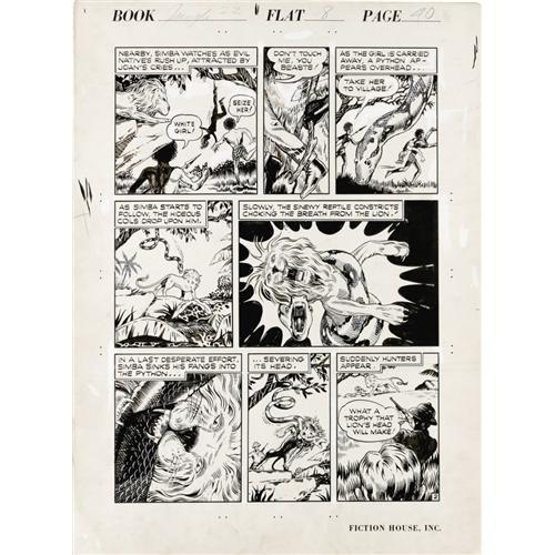 <B>Al Walker - Jungle Comics #22, Complete 6-page Simba Story Original Art (Fiction House, 1941).</B></I> The mighty lion, Simba, stalks jungle injustice, in this six page story by Al Walker. Each page has an image area of 13" x 18", and, aside from some paper tanning, and scattered soiling, the pages average in Very Good condition. <I>From the John McLaughlin Collection</B></I><BR><BR><b>Shipping:</b> Large Flat (<a target="_blank" href="http://www.heritageauctions.com/common/shipping.php">view shipping information</a>)