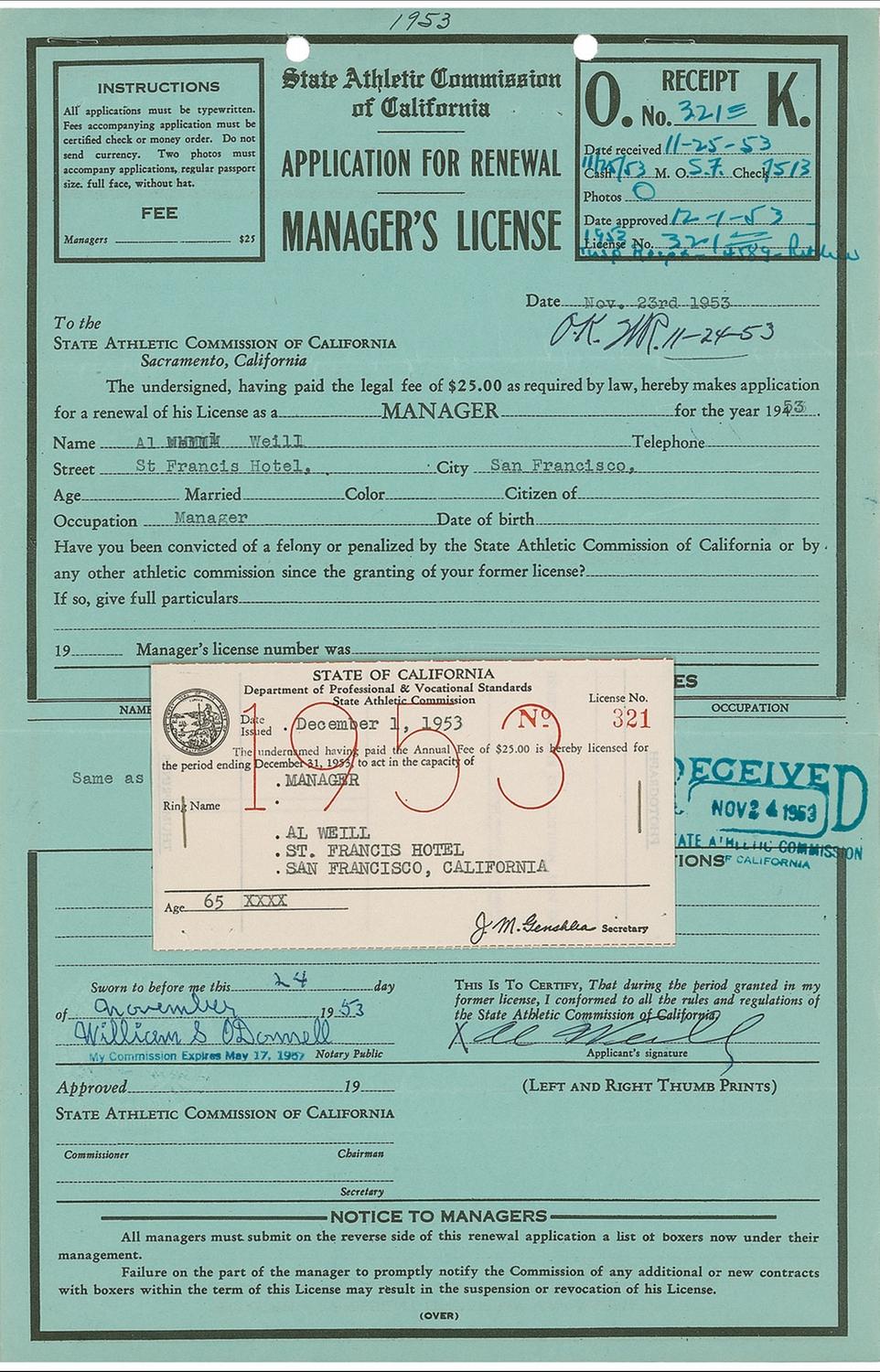 Regarded as one of the most astute boxing managers in history (1893-1969), Weill managed four world champions: Rocky Marciano, Marty Servo, Lou Ambers, Joey Archibald, and several other boxers. DS, signed “Al Weill,” one page both sides, 8.5 x 13, November 23, 1953. Application for renewal for Weill’s manager’s license from the State Athletic Commission of California. Horizontal fold, two filing punch holes, office stamps, and the license stapled to the application with a temporary permit stapled as a second sheet, otherwise fine condition.