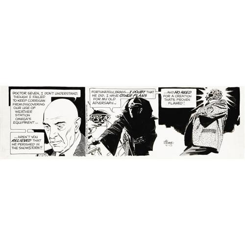 <B>Al Williamson - Secret Agent Corrigan Daily Comic Strip Original Art, dated 4-13-79 (King Features Syndicate, 1979).</B></I> While Brass and Doctor Seven discuss the fate of Corrigan, Seven eighty-sixes an unwanted android, in this beautifully rendered Al Williamson daily. The image area measures 18.5" x 5.5", and the art is in Excellent condition.<BR><BR><b>Shipping:</b> Large Flat (<a target="_blank" href="http://www.heritageauctions.com/common/shipping.php">view shipping information</a>)