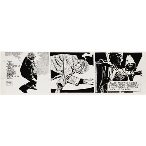 <B>Al Williamson - Secret Agent Corrigan Daily Comic Strip Original Art, dated 4-14-79 (King Features Syndicate, 1979).</B></I> Dr. Seven has no time for damaged android units -- he must turn his attention to Phillip Corrigan! Al Williamson's stylish pen and ink work sizzles in this daily from 1979. The image area measures 18.5" x 5.5", and the art is in Excellent condition.<BR><BR><b>Shipping:</b> Large Flat (<a target="_blank" href="http://www.heritageauctions.com/common/shipping.php">view shipping information</a>)