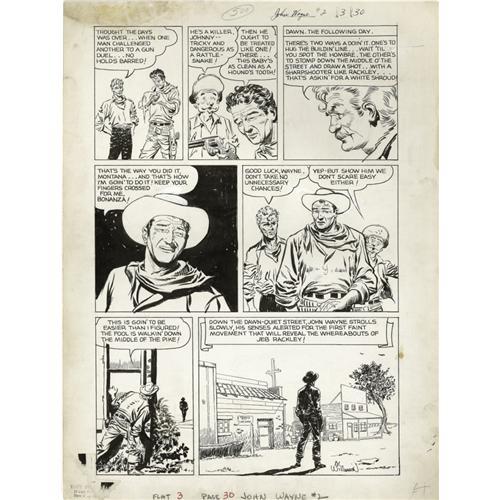 <B>Al Williamson and Frank Frazetta - John Wayne Adventure Comics #2, page 30 Original Art (Toby Press, 1950).</B></I> Al Williamson and Frank Frazetta teamed up to create some beautiful artwork on this seven-paneled page. John Wayne, rendered by two of comicdom's finest talents -- what more could any Western fan ask for?! The image area measures 12" x 18", and the art is in Excellent condition. The page was signed by Al Williamson at the lower right.