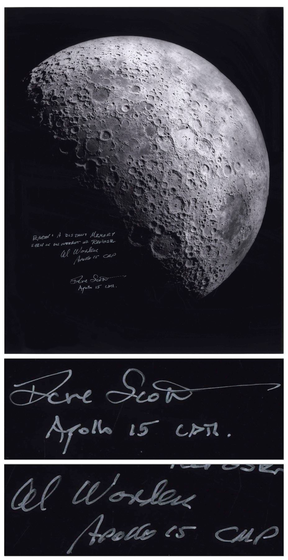 Al Worden and Dave Scott signed 16'' x 20'' photo of a perfectly round moon, as seen from the Apollo spacecraft. The Apollo 15 astronauts sign in silver ink ''Dave Scott / Apollo 15 CDR'' and ''Al Worden / Apollo 15 CMP'' with Worden additionally writing his eloquent statement about viewing the Earth from the moon: ''Earth: A distant memory seen in an instant of repose.'' Glossy photo is in near fine condition.