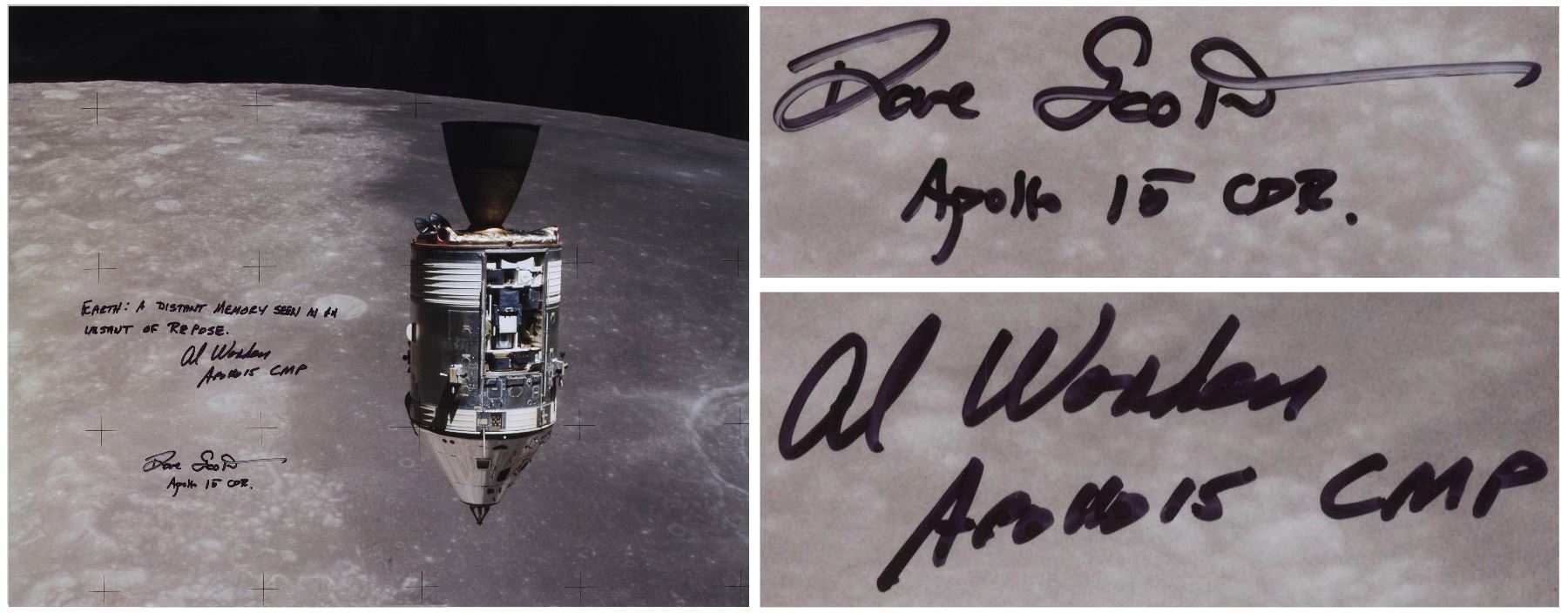 Al Worden and Dave Scott signed 20'' x 16'' photo of the Apollo 15 command module against the moon. The astronauts sign in black ink ''Dave Scott / Apollo 15 CDR'' and ''Al Worden / Apollo 15 CMP'' with Worden additionally writing his eloquent statement about viewing the Earth from the moon: ''Earth: A distant memory seen in an instant of repose.'' Glossy photo is in near fine condition. Both signatures were obtained at Spacefest 2019.