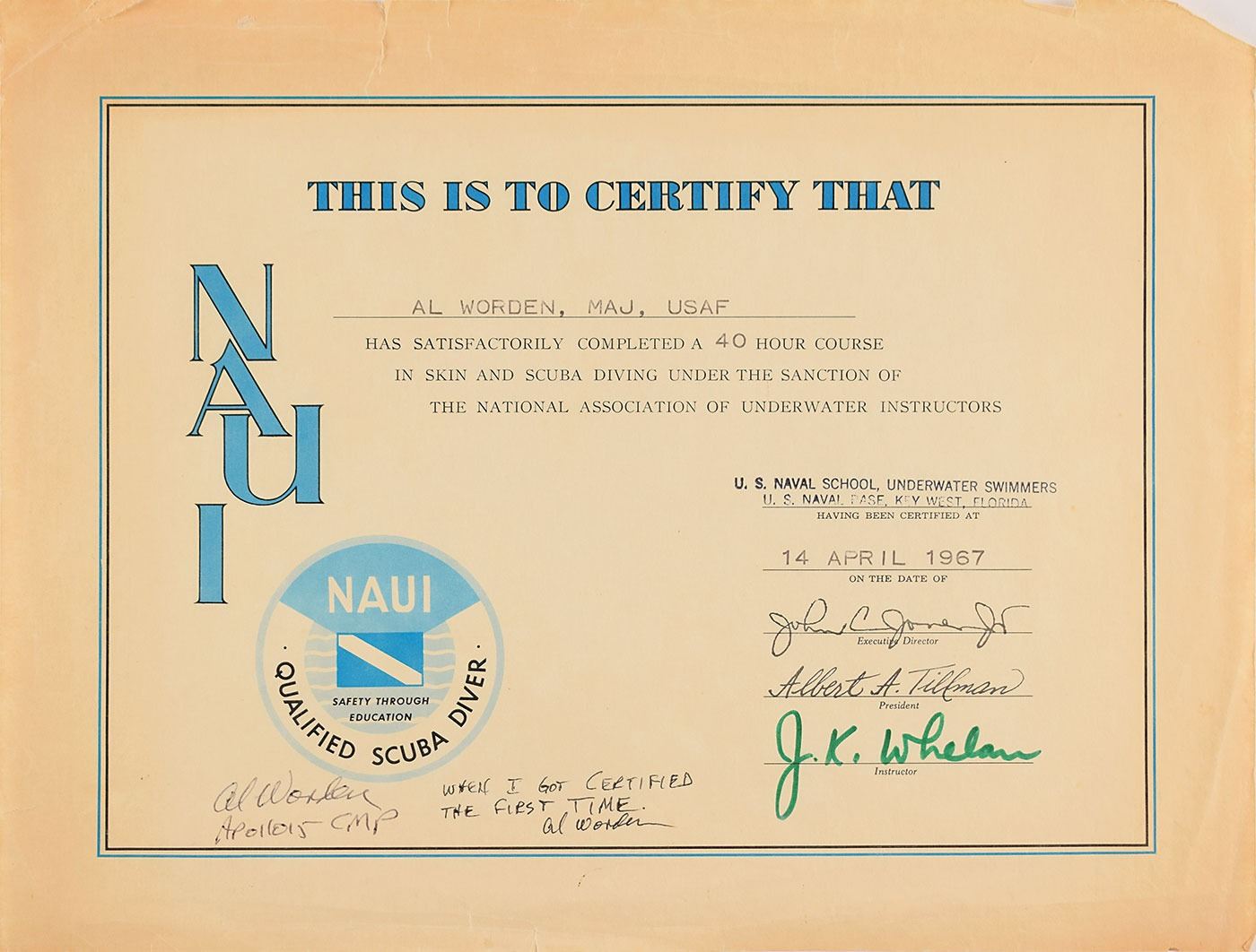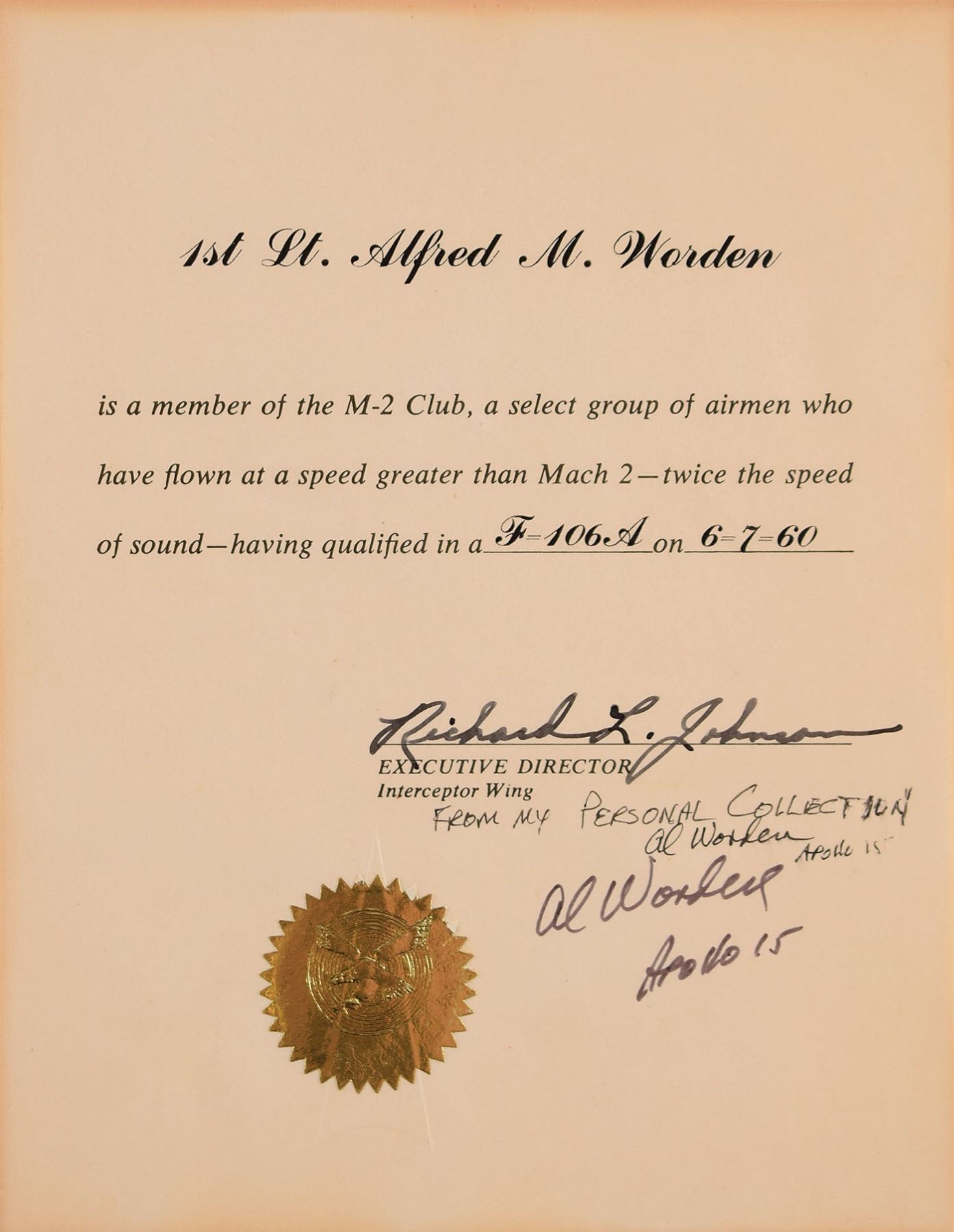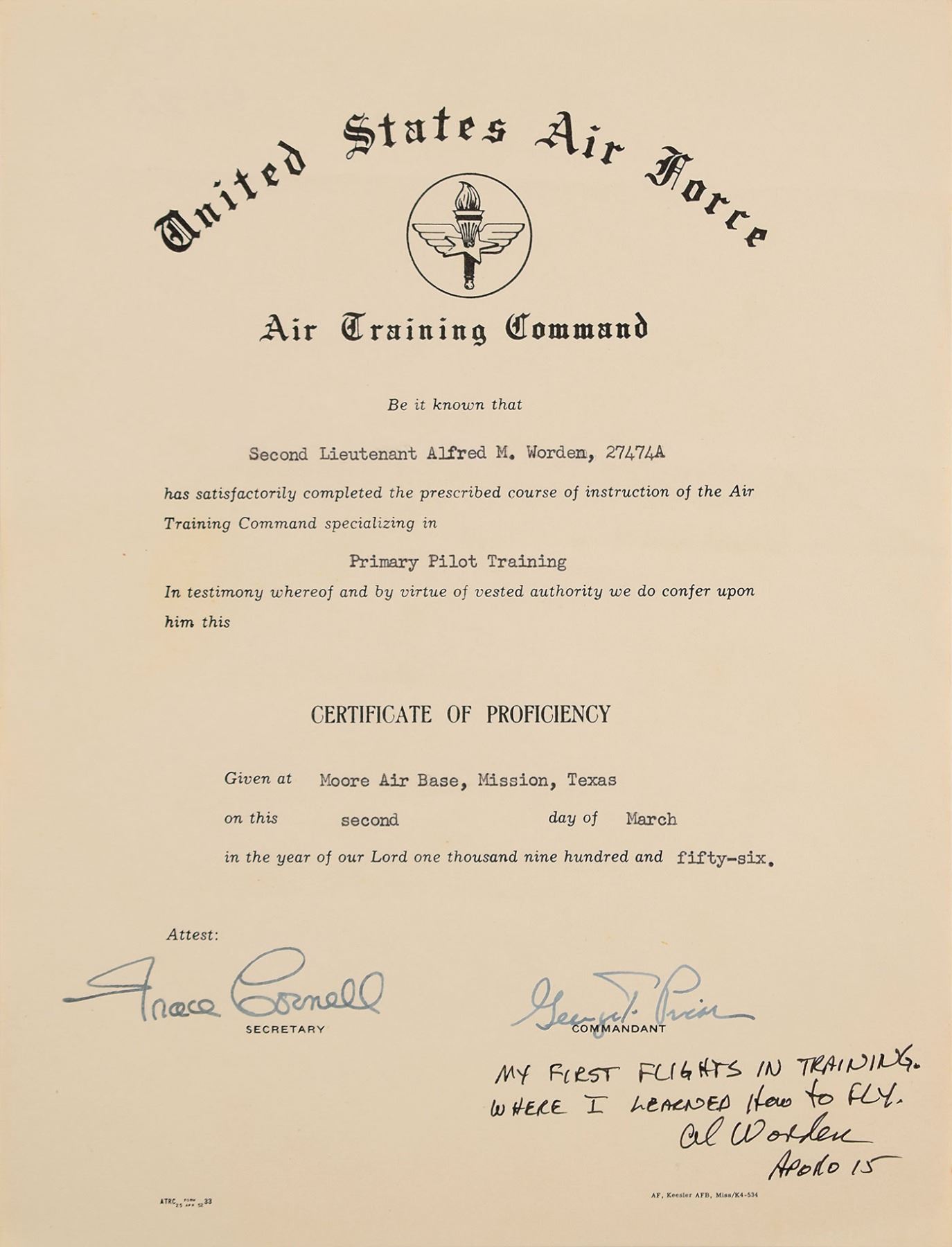 Unprecedented collection of seven military and training certificates awarded to veteran Apollo astronaut Al Worden, each one page, ranging in size from 7 x 9 to 10 x 13, dated between 1956 and 1967, each signed in black ink or felt tip, "Al Worden, Apollo 15," who adds short lines to each document. The group includes: a Certificate of Proficiency in "Primary Pilot Training" from the United States Air Force, Air Training Command, dated March 2, 1956 ("My first flights in training, where I learned how to fly"); a “Jet Fighter Pilot” diploma from the United States Air Force, Air Training Command, dated August 14, 1956 (“Finally made it through flight training at Laredo”); a Convair certificate qualifying Worden as a “Supersonic Delta Darter Delta Pilot,” dated November 18, 1959, signed twice by Worden, who adds: “Went supersonic for the first time”; a certificate affirming Worden’s membership in “the M-2 Club, a select group of airmen who have flown at a speed greater than Mach–2—twice the speed of sound,” signed twice by Worden, who adds: “From my personal collection”; a certificate from the United States Navy, Naval Air Training Command, Helicopter Training Squadron Eight, stating that Worden “completed the prescribed course of Helicopter training for Astronaut,” dated March 23, 1967 (“From my personal collection”); a National Association of Underwater Instructors certificate affirming that Worden has completed a “40 Hour Course in Skin and Scuba Diving,” dated April 14, 1967, signed twice by Worden, who adds: “When I got certified the first time”; and a Certificate of Training from the United States Air Force affirming that Worden has completed the “Basic Tropical Survival and Ethnic Familiarization Course, dated June 16, 1967 (“This is where I developed a taste for iguana and snake”). In overall very good to fine condition, with some edge tears to the NAUI certificate. A fascinating and wholly unusual ‘paper trail’ of the various skill sets and requirements needed to become an Apollo astronaut.