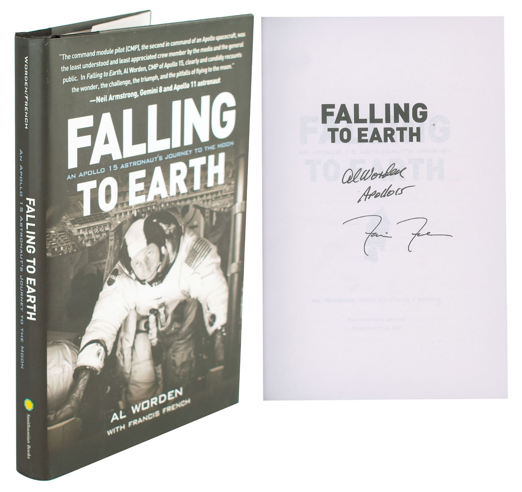 Signed book: Falling to Earth. First edition. Washington, DC: Smithsonian Books, 2011. Hardcover with dust jacket, 6.25 x 9.25, 300 pages. Signed on the half-title page in black felt tip, "Al Worden, Apollo 15," and also signed by his co-author, "Francis French." Also includes a color 5.5 x 8.5 insert featuring a poem entitled 'Rising From Earth,' which is also signed in black felt tip by Worden. In overall fine condition.
