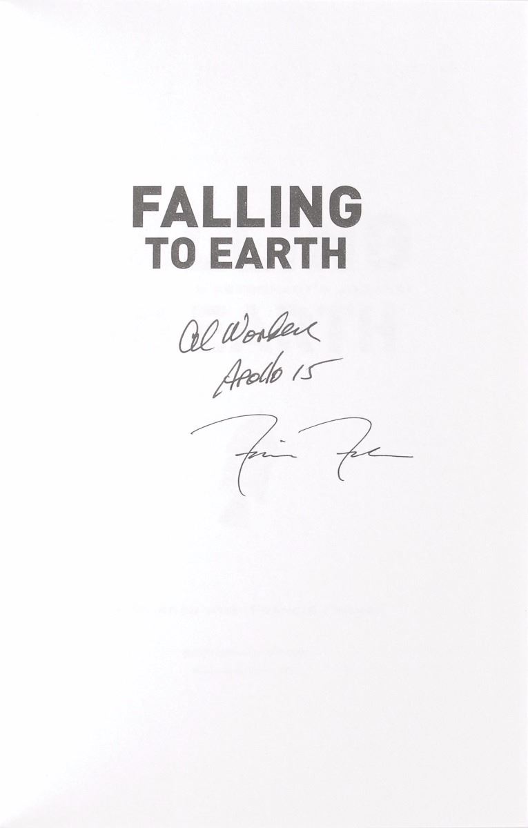 Signed book: Falling to Earth. First edition, first printing. Washington, DC: Smithsonian Books, 2011. Hardcover with dust jacket, 6.25 x 9.25, 300 pages. Signed on the half-title page in black felt tip, “Al Worden, Apollo 15,” and also signed by his co-author, “Francis French.” Also includes a color 5.5 x 8.5 insert featuring a poem entitled ‘Rising From Earth,’ also signed in black felt tip by Worden. In fine condition.