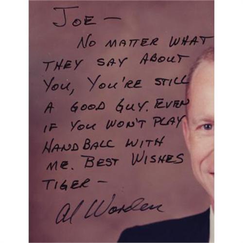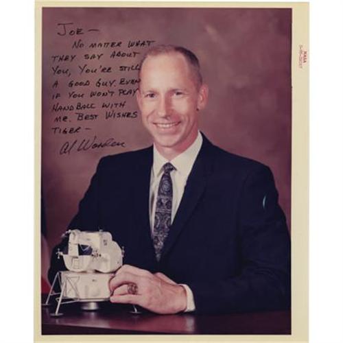 <B>Al Worden Signed Color Photograph,</B></I> 8" x 10", "<I>Joe-/ No matter what/ they say about/ you, You're still/ a good guy, even/ if you won't play/ Hand Ball with/ me. Best Wishes/ Tiger./ Al Worden.</B></I>" <I>From the collection of renowned former physical trainer of the astronauts Joe Garino. This lot is accompanied by a signed certificate of authentication from Garino verifying its provenance.</B></I><BR><BR><b>Shipping:</b> Flat Material, Small (<a target="_blank" href="http://www.heritageauctions.com/common/shipping.php">view shipping information</a>)