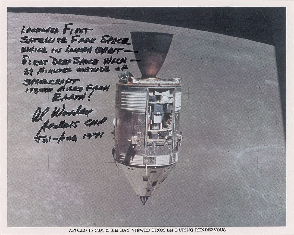 Two items: an official color 10 x 8 NASA litho of the Apollo 15 CSM and SIM bay viewed from the lunar module during rendezvous, signed in black felt tip, “Launched first satellite from space while in lunar orbit—first deep space walk—39 minutes outside of spacecraft 197,000 miles from Earth! Al Worden, Apollo 15 CMP, Jul–Aug 1971”; and an original NASA 70 mm transparency of one 2 x 2 frame of film taken during the Apollo 15 mission, dated July 26, 1971, depicting a towering lunar mountain, mounted within a 5.5 x 8.75 cardboard viewing holder. Signed on the mount in black ink, “First deep space walk—197,000 miles from Earth! Al Worden, Apollo 15 CMP.” The transparency is listed as frame number “AS15-87-11752” from flight “CM 12 LM10,” and captured with camera “SEB33100040–307” and film magazine “KK.” In overall fine condition. From the collection of aerospace memorabilia specialist Ken Havekotte.
