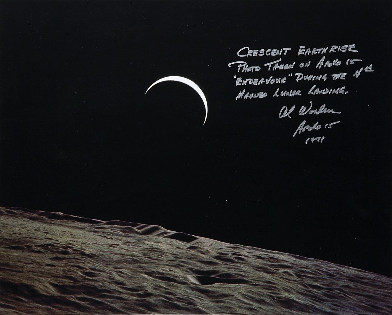 Haunting color satin-finish 20 x 16 photo of the thumbnail Earth hanging above a rolling lunar surface, signed in silver ink, “Crescent Earthrise photo taken on Apollo 15 ‘Endeavour’ during the 4th manned lunar landing, Al Worden. Apollo 15, 1971." In fine condition.