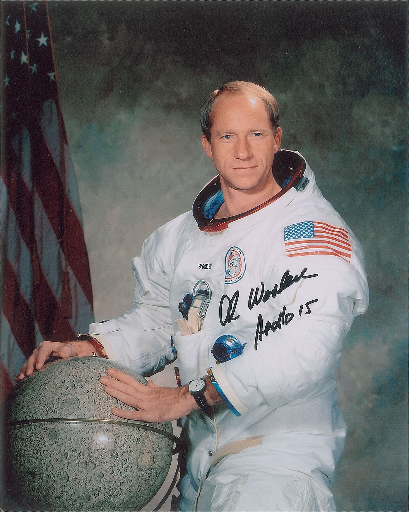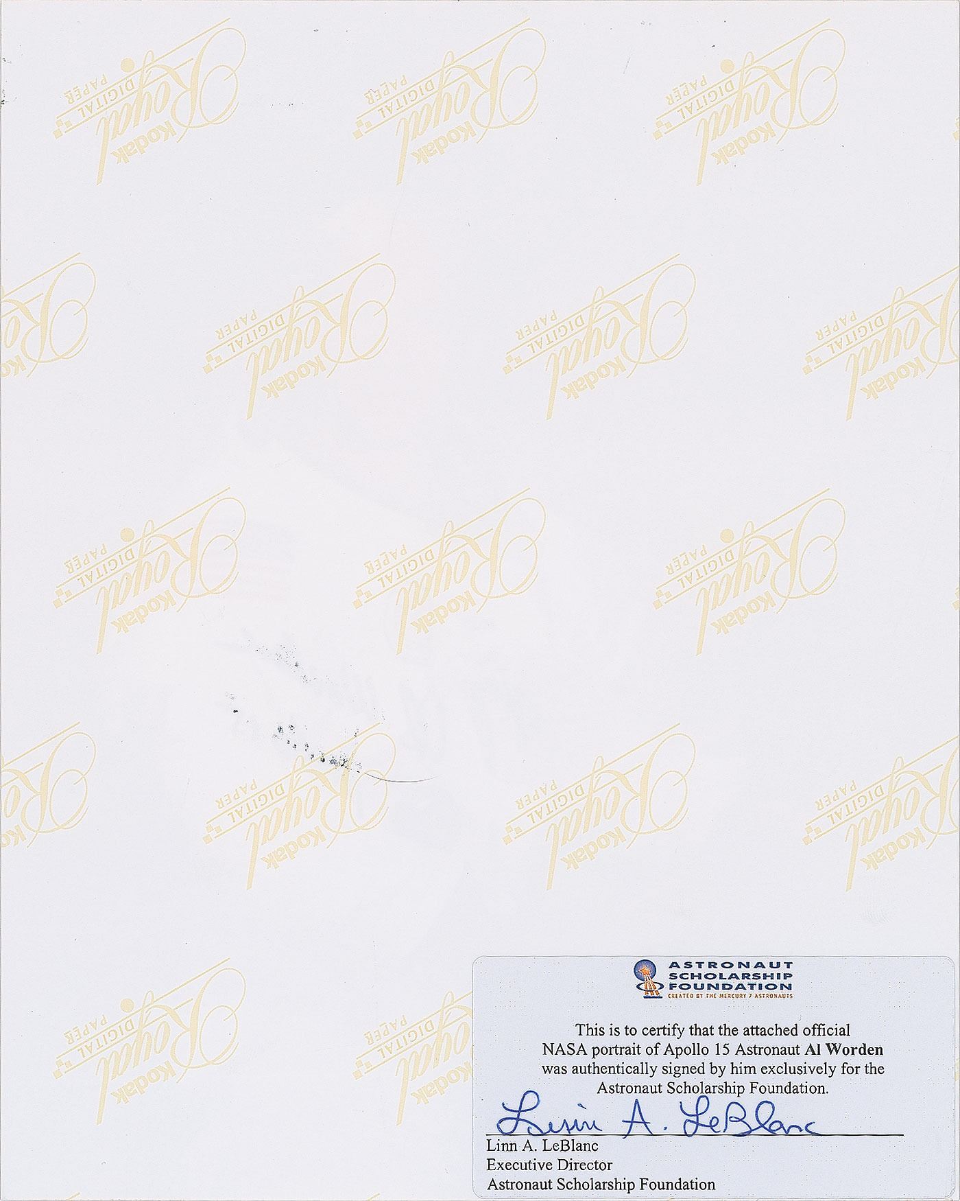 Choice color satin-finish 8 x 10 photo of Worden posing in his white space suit with a lunar globe, signed in black felt tip, "Al Worden, Apollo 15." Reverse bears an affixed Astronaut Scholarship Foundation authentication label. In very fine condition.