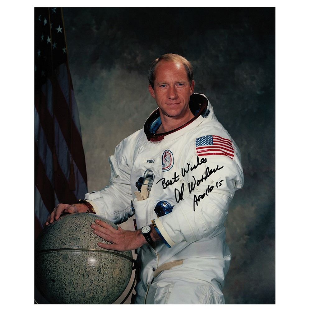 Color satin-finish 8 x 10 photo of the Apollo 15 CMP wearing his white space suit and posing with a lunar globe, signed in black felt tip, "Best wishes, Al Worden, Apollo 15." In fine to very fine condition.