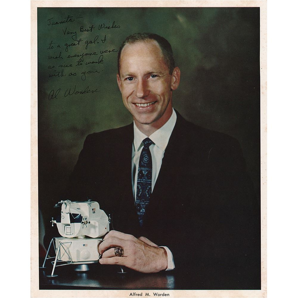 Official color vintage 8 x 10 NASA lithograph of Worden posing with a Lunar Module model, signed and inscribed in black felt tip, "Juanita—Very best wishes to a great gal. I wish everyone were as nice to work with as you. Al Worden.†In very good to fine condition, with a light crease to his left sleeve and foxing to the reverse (not affecting the image). From the collection of Apollo flight crew support member Juanita Adkins.