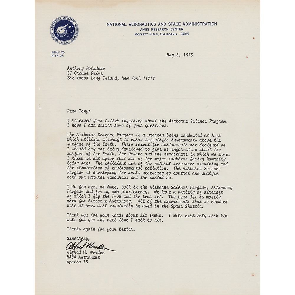 TLS signed “Alfred Worden,” one page, 8 x 10.5, NASA letterhead, May 8, 1973. Letter to Anthony Polidoro, responding to an inquiry about the Airborne Science Program. In part: "The Airborne Science Program is being conducted at Ames which utilizes aircraft to carry scientific instruments above the surface of the Earth. These scientific instruments are designed or I should say are being developed to give us information about the surface of the Earth, the Oceans and the atmosphere in which we live. I think we all agree that two of the major problems facing humanity today are: The efficient use of the natural resources remaining and the elimination of environmental pollution. The Airborne Science Program is developing the tools necessary to control and analyze both our natural resources and the pollution. I do fly here at Ames, both in the Airborne Science Program, Astronomy Program and for my own proficiency. We have a variety of aircraft of which I fly the T-38 and the Lear Jet. The Lear Jet is mostly used for Airborne Astronomy. All of the experiments that we conduct here at Ames will eventually be used in the Space Shuttle." In fine condition.