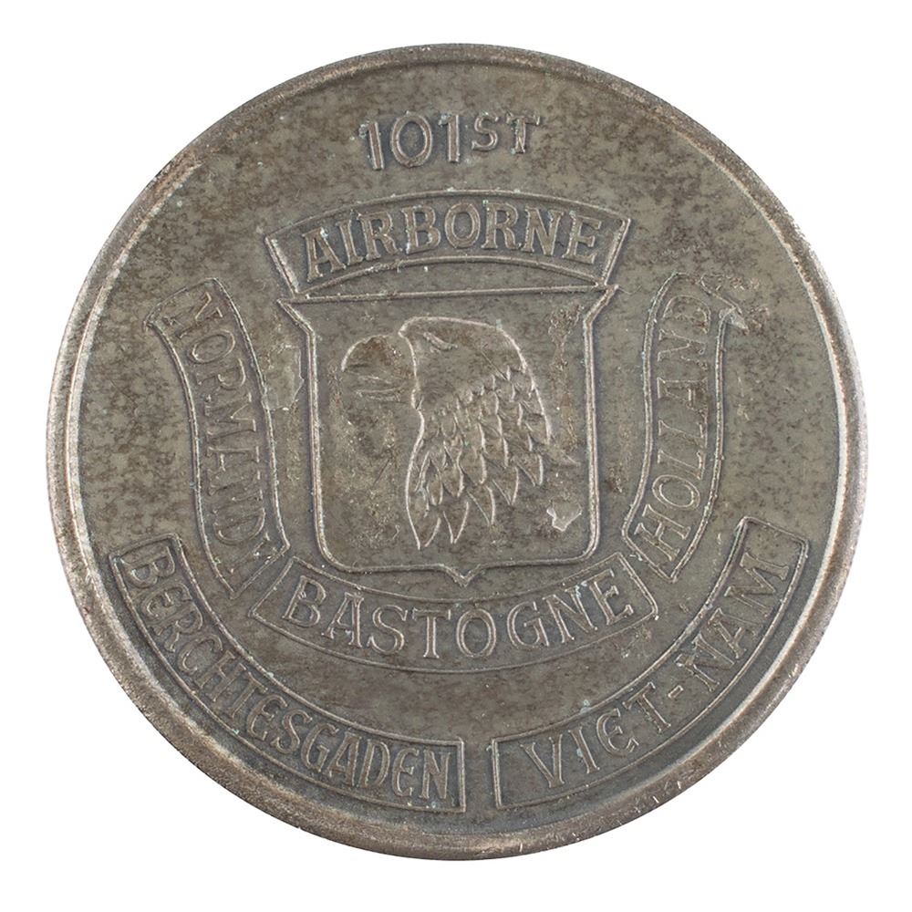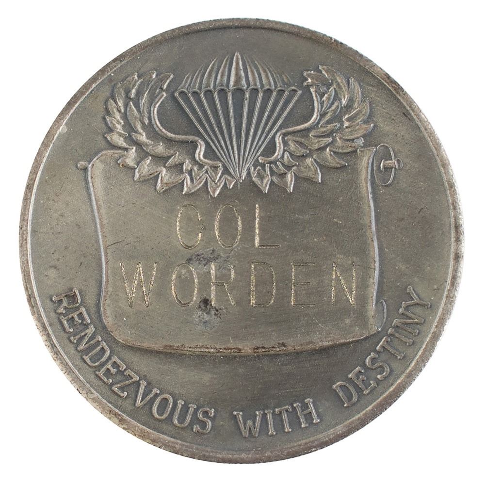 Al Worden's silver-tone 101st Airborne Vietnam challenge coin, 22 gm, 38 mm, with the front featuring the emblem of the 101st Airborne Division, with raised text indicating military engagements in Normandy, Bastogne, Holland, Berchtesgaden, Viet-Nam; and the reverse bearing parachutist insignia with embossed lower text, “Rendezvous with Destiny,” and the central plaque engraved: “Col. Worden.” In fine condition.