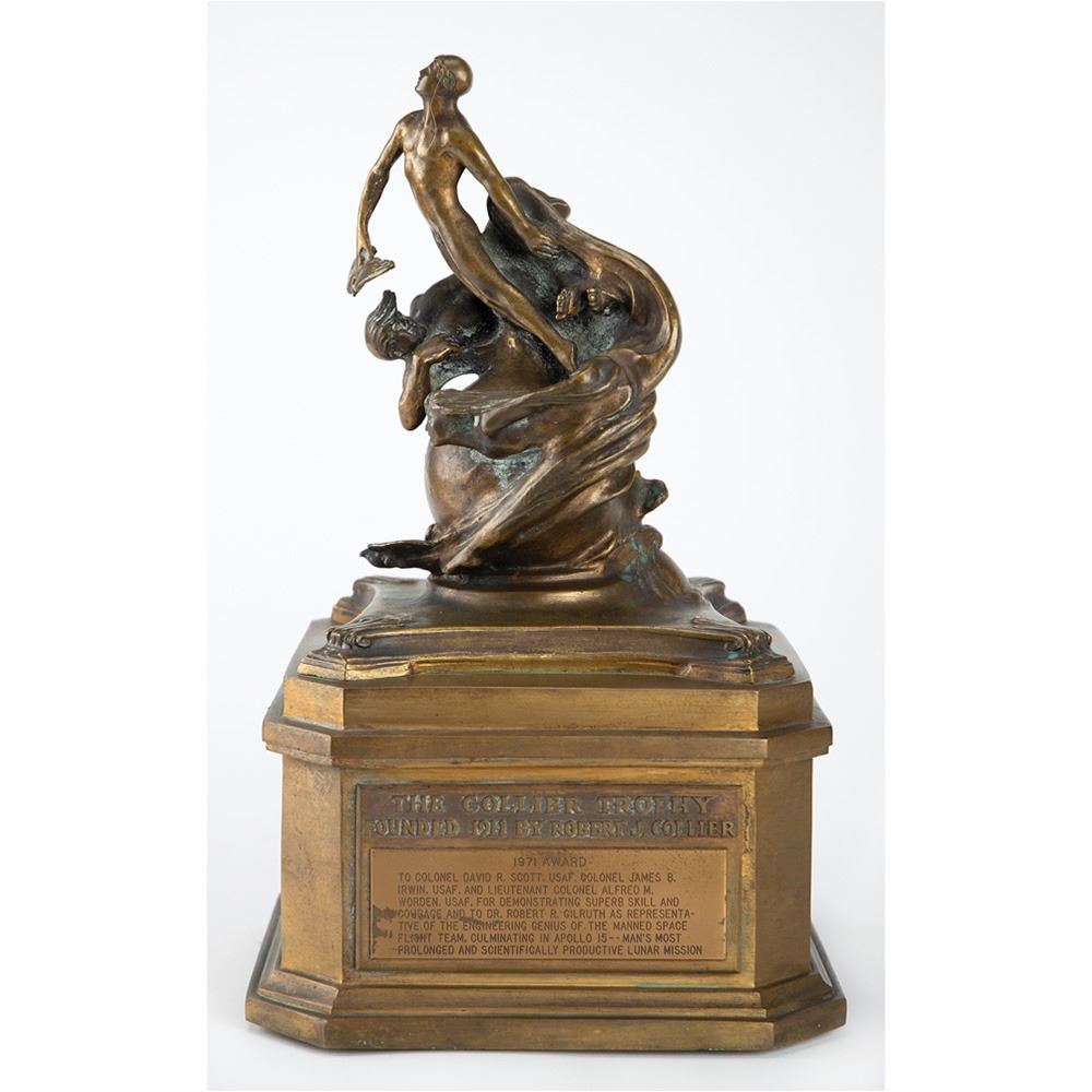 Impressive Collier Trophy awarded to Al Worden as one of the crewmen on Apollo 15, measuring 13.5″ tall with an 8.25˝ by 8.25˝ base, engraved on one side to honor the mission: "1971 Award: To Colonel David R. Scott, USAF, Colonel James B. Irwin, USAF, and Lieutenant Colonel Alfred M. Worden, USAF, for demonstrating superb skill and courage, and to Dr. Robert R. Gilruth as representative of the engineering genius of the manned space flight team, culminating in Apollo 15—man's most prolonged and scientifically productive lunar mission." On the opposing side of the base is raised text describing the award, in full: “Awarded annually by the National Aeronautic Association sponsored by National Aviation Club for the greatest achievement in aeronautics or astronautics in America, the value of which had been thoroughly demonstrated by actual use during the preceding year.” Includes a small wooden identification plaque. In fine condition.