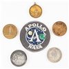Five commemorative medallions from the collection of Al Worden, including: a medal commemorating the Apollo 11 lunar landing mission; a commemorative Apollo 13 medal produced by the Franklin Mint; a medal honoring Apollo 15, depicting the LRV on the lunar surface; a medallion honoring the 40th anniversary of Apollo 15, containing metal flown to the moon on Apollo missions; and a medal honoring the 25th anniversary of the Space Shuttle missions. Also includes a 3è embroidered "Apollo / NASA" patch. In overall very good to fine condition, with significant tarnishing to the Apollo 11 medallion.