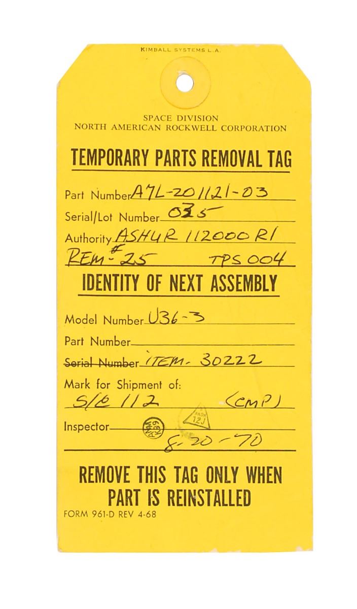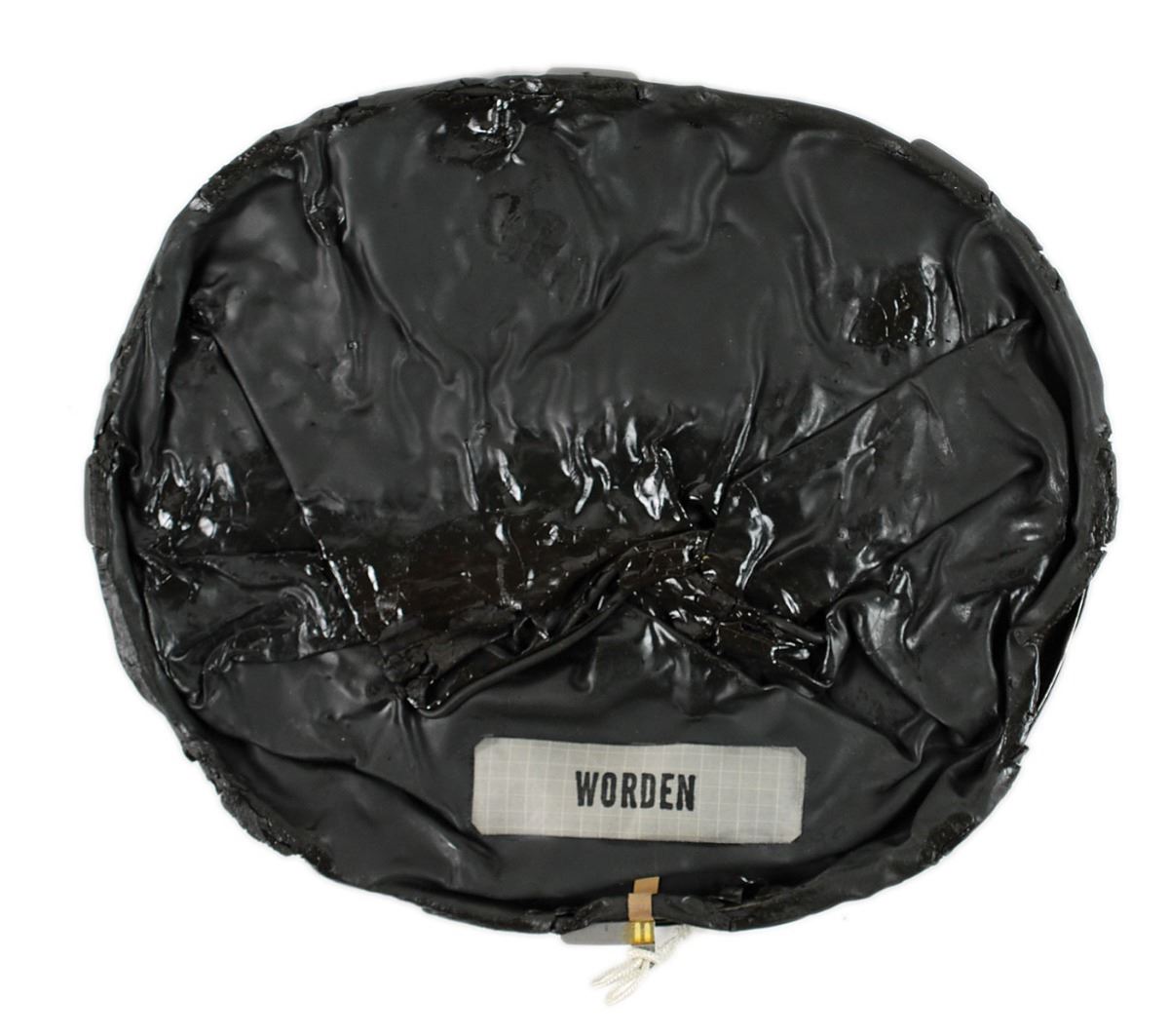 An A7L Spacesuit Neck Dam Assembly, 10.75 x 9, labeled “Worden” on a gray patch. The component is comprised of a thin metal ring encircling black rubber, which is folded over and stuck together. A white lanyard is attached below Worden’s name patch, with a white plastic snap connector at the end. In very good condition, with the rubber very brittle.