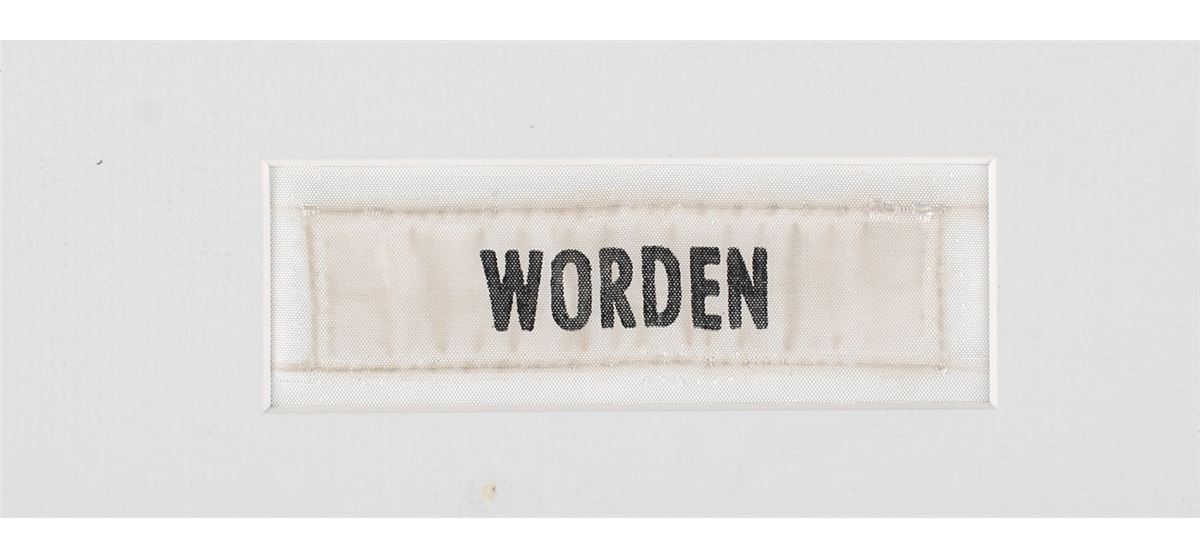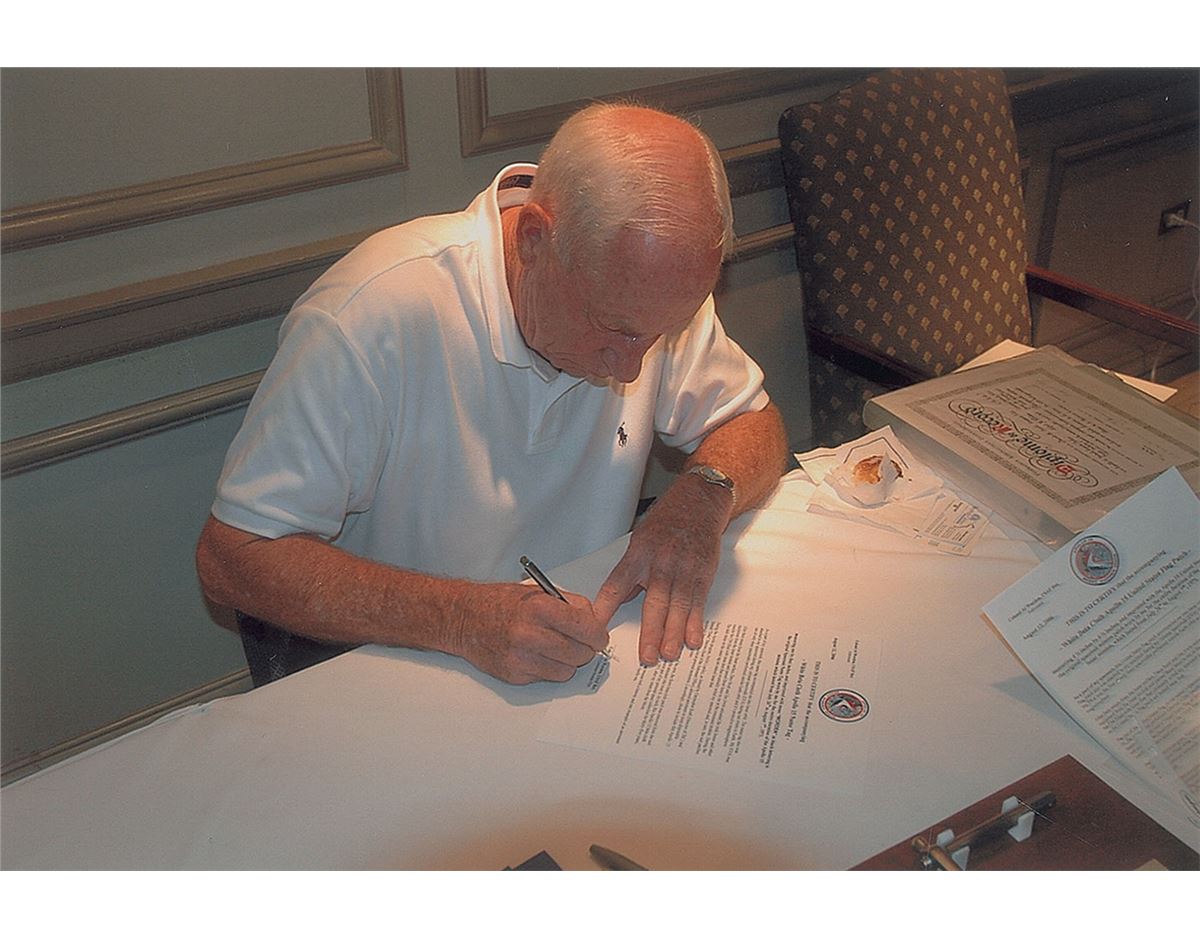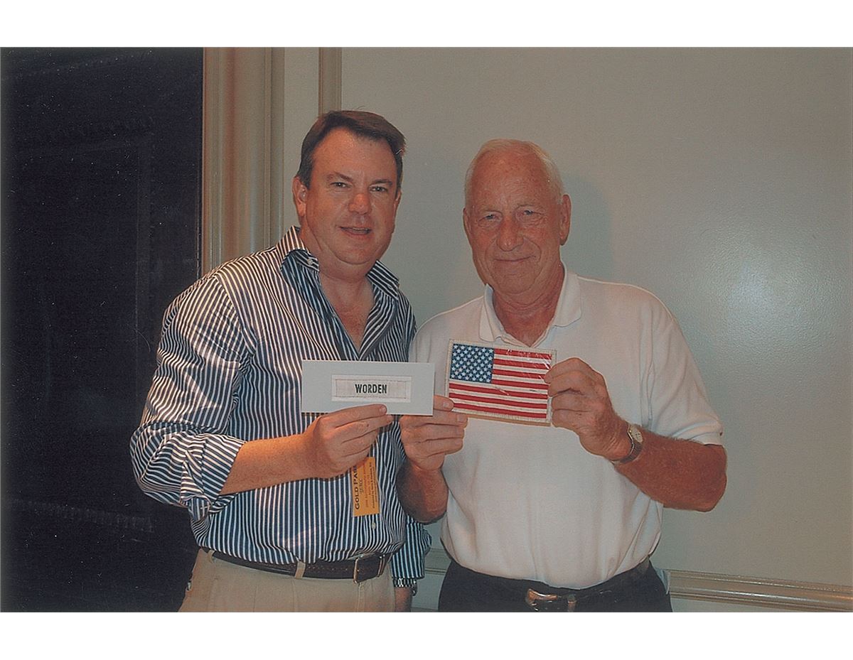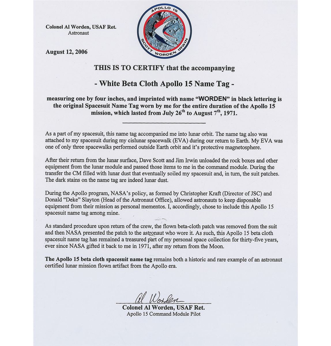 One-of-a–kind flown Beta cloth name patch, 5 x 2, worn on the exterior of Worden’s spacesuit during the entirety of the Apollo 15 mission. Worn on the front of his spacesuit throughout the twelve-day mission and exposed to the vacuum of deep space during Worden’s 38-minute extra-vehicular activity, the patch exhibits general light wear and soiling from lunar dust, but is in otherwise fine condition. Simply matted to an overall size of 7.5 x 3. Accompanied by a detailed letter of provenance signed by Worden, in part: “As a part of my spacesuit, this name tag accompanied me into lunar orbit. The name tag also was attached to my spacesuit during my cislunar spacewalk (EVA) during our return to Earth. My EVA was the first of only three spacewalks performed outside Earth orbit and it’s protective magnetosphere. After their return from the lunar surface, Dave Scott and Jim Irwin unloaded the rock boxes and other equipment from the lunar module and passed those items to me in the command module. During the transfer, the CM filled with lunar dust that ultimately soiled my spacesuit and, in turn, the suit patches. The dark stains on the United States flag patch are indeed lunar dust.” Also included are four photos of Worden taken at the time of signing. Emblazoned with the surname of one of just twenty-four people to have flown to the moon, this is an exceedingly rare personal piece.