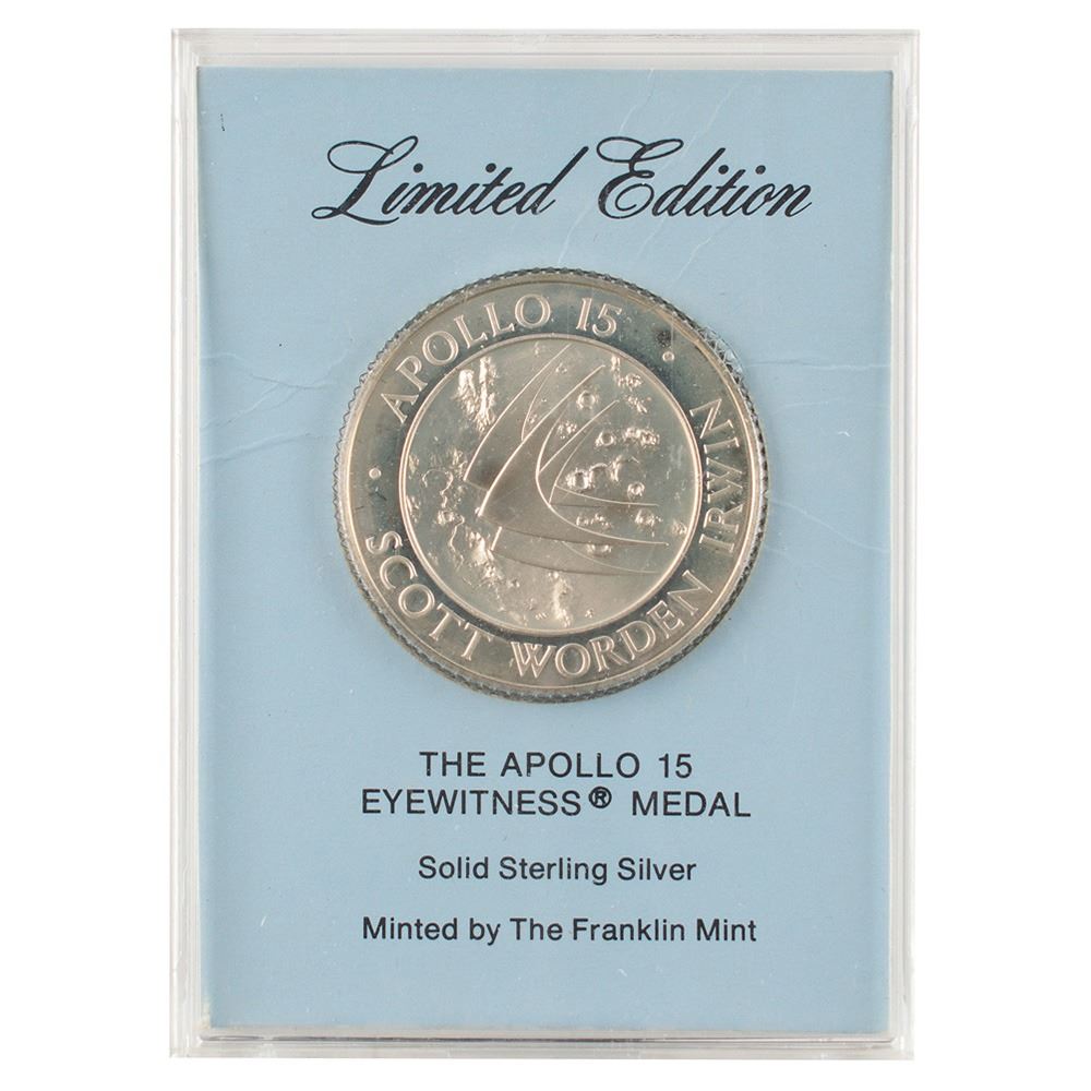 Al Worden's limited edition sterling silver medallion honoring the Apollo 15 mission, 35 gm, 39 mm, minted by The Franklin Mint. The front features the Apollo 15 mission insignia, and the reverse shows a raised image of a lunar EVA. Sealed in its original presentation holder. In fine condition, with some creasing to cardboard holder. Includes the original plastic case, stand, and shipping box. Accompanied by a certificate of authenticity issued as No. 14634.
