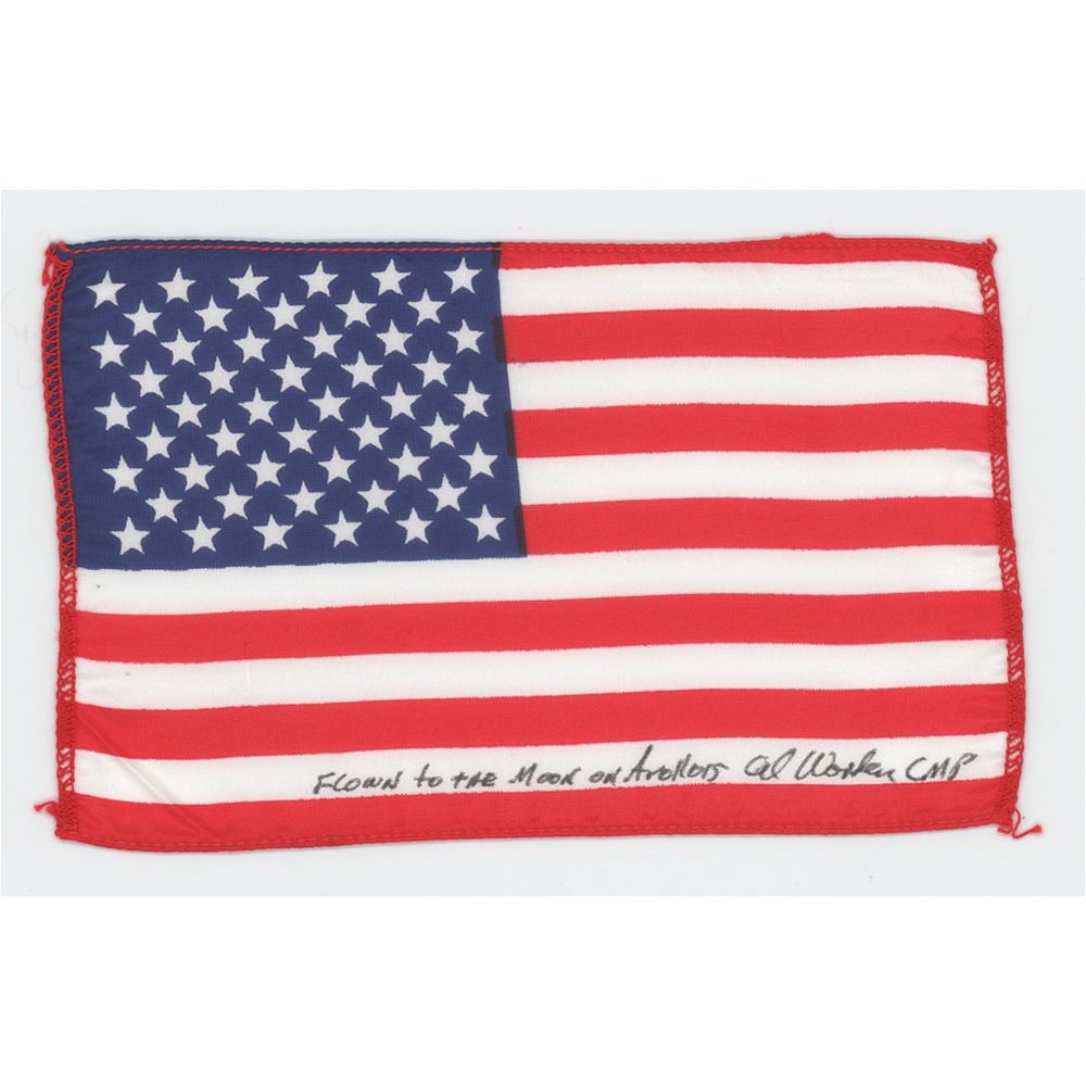 Al Worden's flown American flag carried on the Apollo 15 Command Module 'Endeavour,' 6.25 x 4, signed and flight-certified in black felt tip, "Flown to the Moon on Apollo 15, Al Worden, CMP." In fine condition. Accompanied by a detailed letter of provenance signed by Worden, in part: "I hereby certify that the United States flag included with this letter and marked with my signature and flight number went to the moon aboard Apollo 15 in the spacecraft 'Endeavour.' It remained in the command module during the lunar orbit phase of the flight. It has been in my personal possession since then."