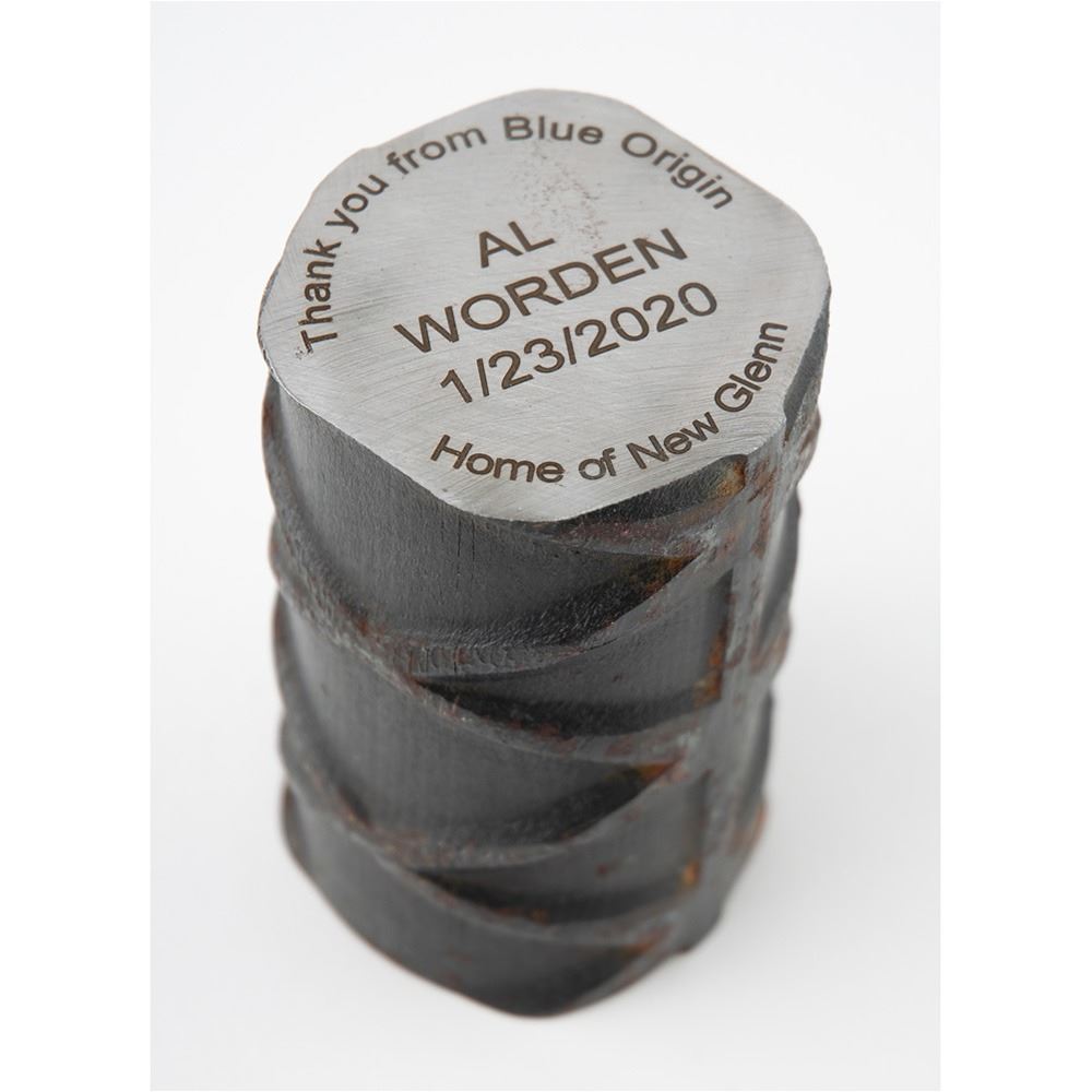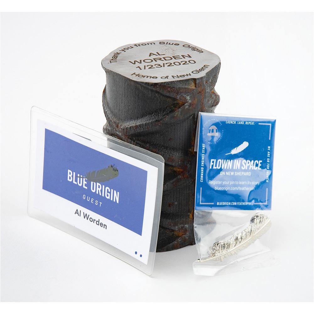 Three of Al Worden's personally-owned Blue Origin items: a Blue Origin feather pin flown in space on New Shepard, serial no. 0000588, in its original package; a heavy 4˝ long segment of metal from Cape Canaveral's Launch Complex 36 (leased by Blue Origin), engraved on the top, "Thank you from Blue Origin, Al Worden, 1/23/2020, Home of New Glenn," and on the bottom, "Gradatim Ferociter, Vehicle Access Tower Foundations, LC-36, Est. 2000"; and Worden's personal Blue Origin "Guest" name badge. In overall fine condition.