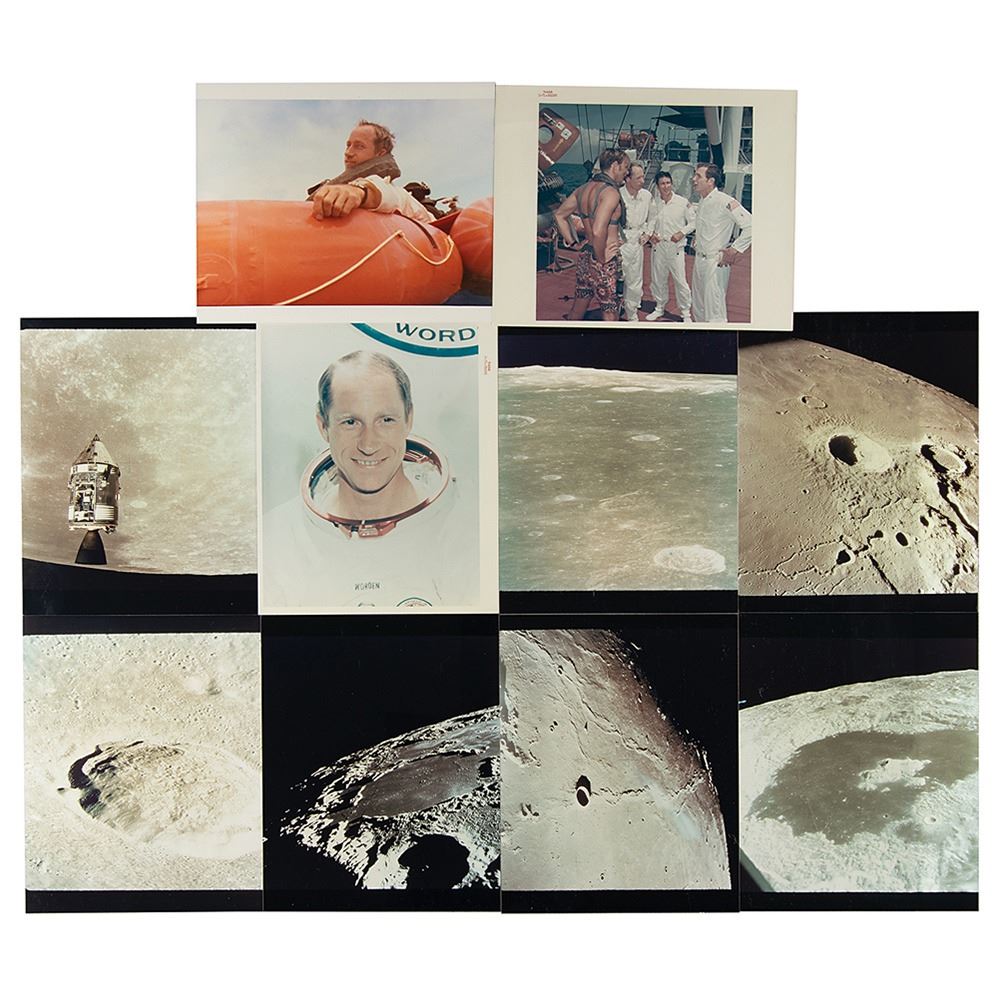 Al Worden‰Ûªs collection of 50 photos related to the Apollo 15 moon-landing mission. The collection includes two vintage official red-numbered glossy NASA photos (S-71-34286 and S-71-39484), an official NASA white space suit lithograph of Worden, two glossy prints of the Apollo 15 ‰Û÷crescent Earthrise,' and a total of 45 color semi-glossy photos, 8 x 10 and 10 x 8, the reverse of each bearing ‰ÛÏThis Paper Manufactured by Kodak‰Û watermarks. The latter group of photographs contains a variety of images from the mission, such as the Saturn V rocket, splashdown and recovery, the crew during lunar EVAs, and over 30 images of the moon, which were originally taken by Worden while in lunar orbit inside the Command Module Endeavour. The backs of the two red-numbered photos contain purple NASA caption text and ‰ÛÏA Kodak Paper‰Û watermarks. In overall fine condition.