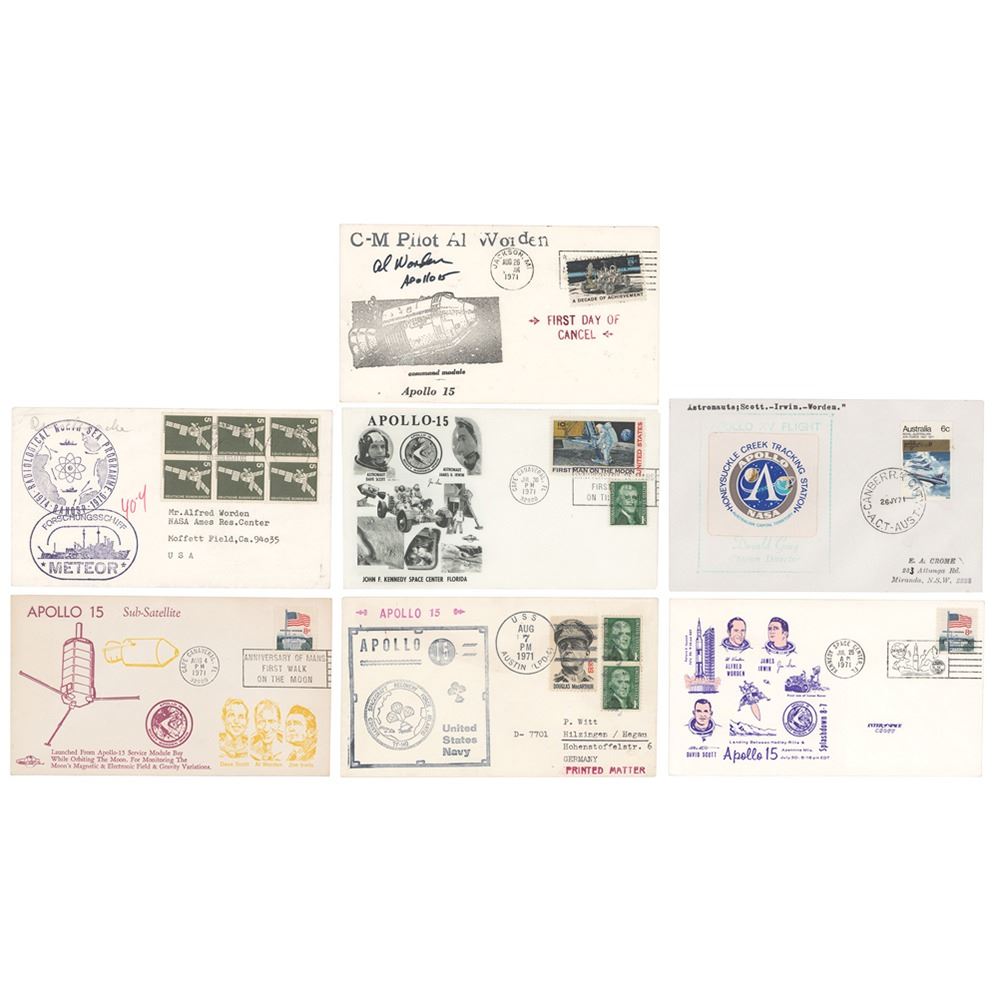 Al Worden's collection of seven commemorative or first day covers, with cachets honoring or related to the Apollo 15 mission, with one signed in black felt tip, "Al Worden, Apollo 15." Other cachets relate to the Meteor research vessel (addressed to "Mr. Alfred Worden, NASA Ames Res. Center"), the Apollo 15 crew and recovery operations, the Apollo 15 Sub-Satellite, and the Honeysuckle Creek Tracking Station. In overall fine condition.