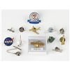 Group of 11 space and aviation pins from the personal collection of Apollo 15 CMP Al Worden, including: an enameled pin honoring the 5th anniversary of Apollo 15; an enameled NASA 'meatball' logo pin; a golden three-dimensional Wright Flyer pin; an Air Force Association (AFA) tie tack; and pins of various jets, airplanes, and spacecraft. In overall fine condition, with tarnishing to a few pins.