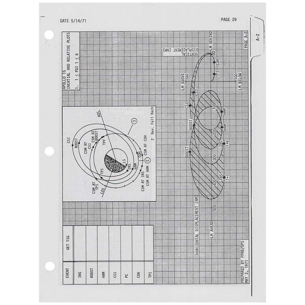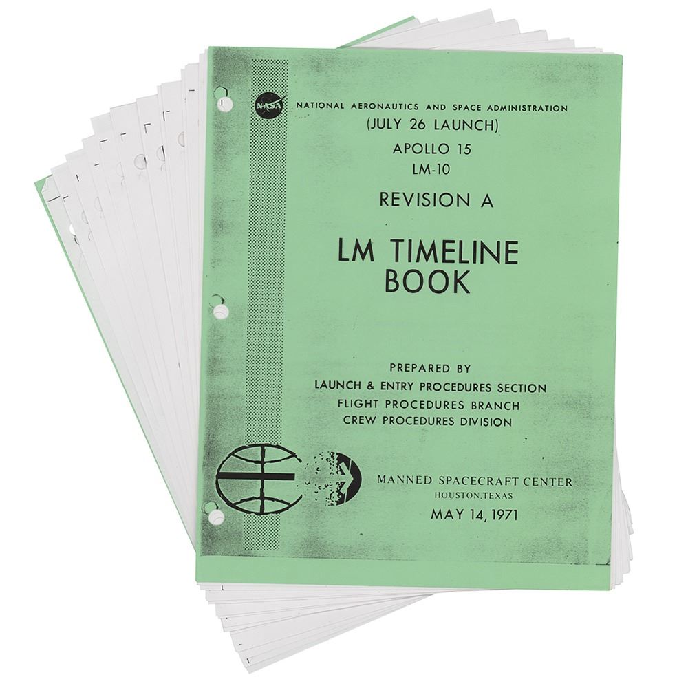Al Worden’s unbound copy of a NASA manual for the Apollo 15 mission entitled “LM Timeline Book,†with header: “(July 26 Launch), Apollo 15, LM-10, Revision A.†40 pages, 8.5 x 11, dated May 14, 1971, and prepared by Launch & Entry Procedures Section, Flight Procedures Branch of the Crew Procedures Division. The manual contains diagrams, charts, and detailed step-by-step guides relating to various aspects of the mission. The first page bears a facsimile signature of Dave Scott that is inherent to the original copy. In fine condition.