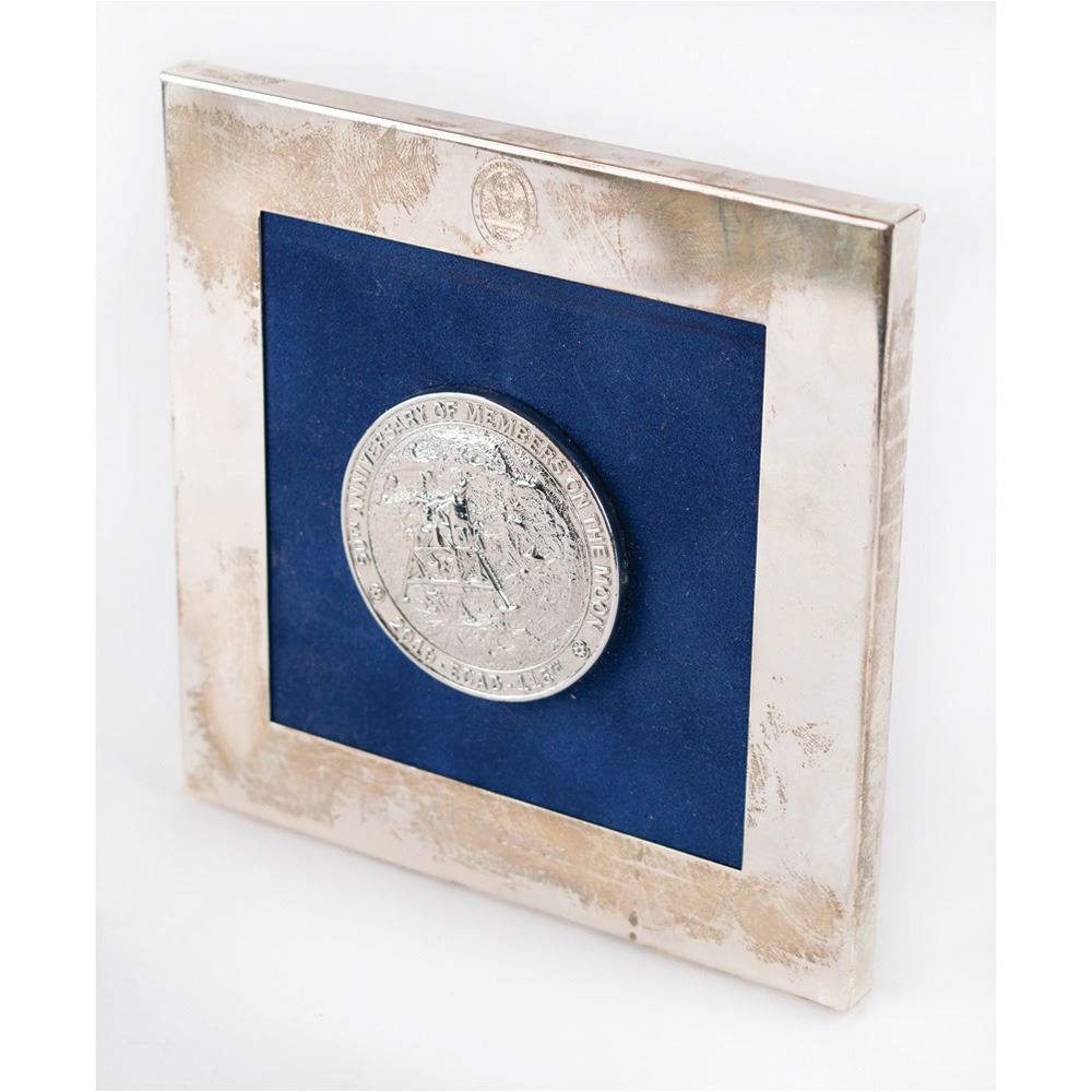 Al Worden’s rare commemorative medallion display presented to him at the 115th Explorers Club Annual Dinner held on March 16, 2019, at the Broadway Lounge and Ballroom at New York’s Marriott Marquis. The display consists of a silver-tone medal, 2˝ in diameter, with raised image of a lunar module over the moon, encircled with the text: “50th Anniversary of Members on the Moon, 2019–ECAD–115th.” The medal is mounted to a Tiffany & Co. sterling silver (Ag 925) frame, 5˝ x 5˝, with the lower border engraved: “Al Worden, Apollo 15.” In fine condition, with various smudging and/or fingerprint marks to frame.