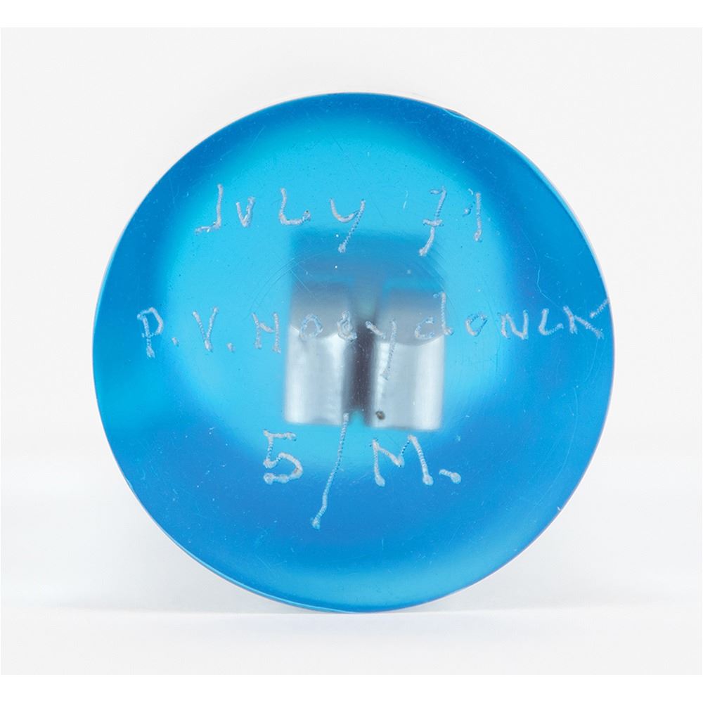 Al Worden's 'Fallen Astronaut' statue by Paul Van Hoeydonck, evidently an early example or prototype created by the artist in 1971 prior to the Apollo 15 flight. The sculpture consists of a 3.25è long stylized aluminum figure representing an astronaut in a spacesuit, cast in a 5è tall blue acrylic tube, etched on the bottom: "July 71, P. V. Hoeydonck, 5/M." This represents the first iteration of Van Hoeydonck's sculpture, which was originally set inside an acrylic tube so that it could stand upright on the moon. The sculpture had to comply with several safety regulations‰ÛÓit had to be non-magnetic, with no sharp edges, and be small and lightweight. Shortly before launch, NASA decided that the plastic tube was a potential fire hazard, and Van Hoeydonck rushed an unencapsulated statue to Apollo 15 CDR Dave Scott to be taken on the lunar landing mission. The astronauts left the 'Fallen Astronaut' statue on the lunar surface, along with a plaque honoring the fourteen known fallen space explorers.