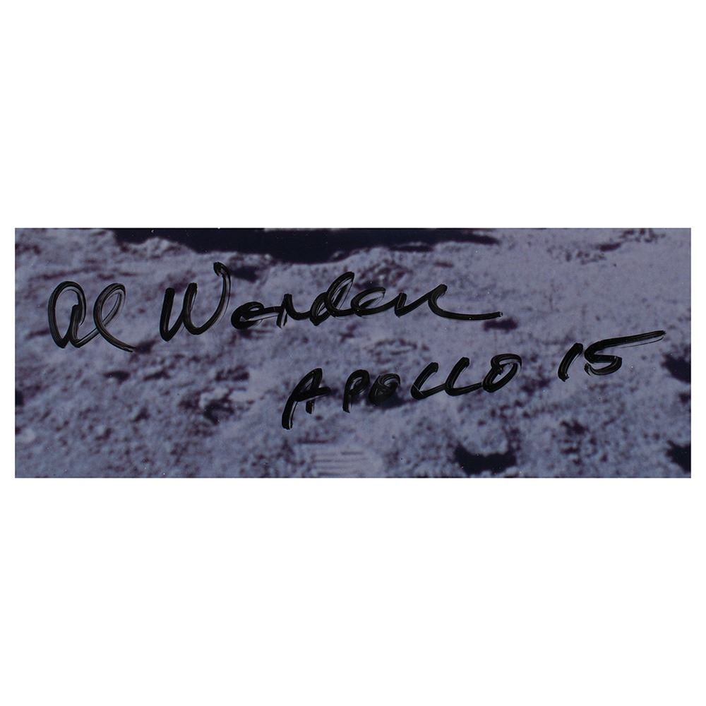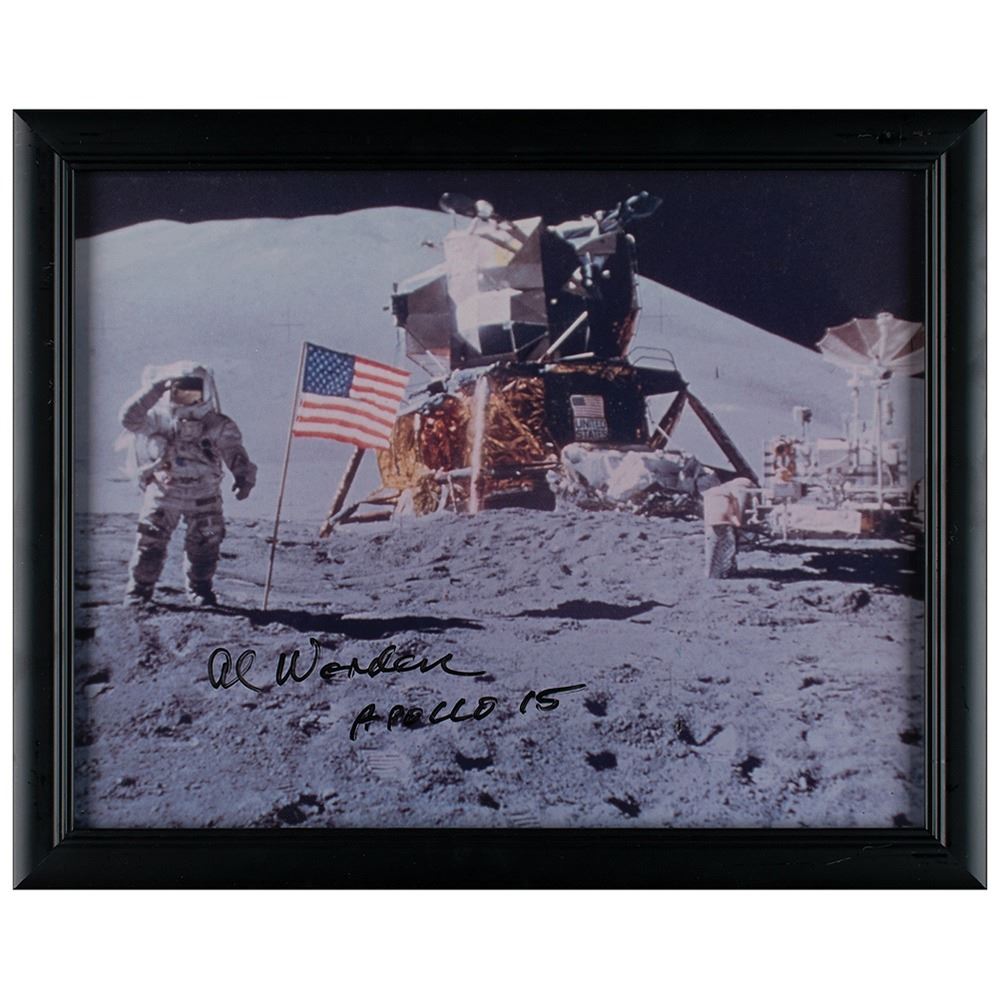 Two oversized signed photographs from Al Worden's personal collection: a color glossy 14 x 11 photo of the Saturn V at Kennedy Space Center, signed in black felt tip, "Al Worden, Apollo 15"; and a color glossy 14 x 11 of Apollo 15 CDR Dave Scott saluting the American flag on the lunar surface, signed in black felt tip "Al Worden, Apollo 15." Individually framed and in overall fine condition, with a few small surface stains to the launch pad photo.