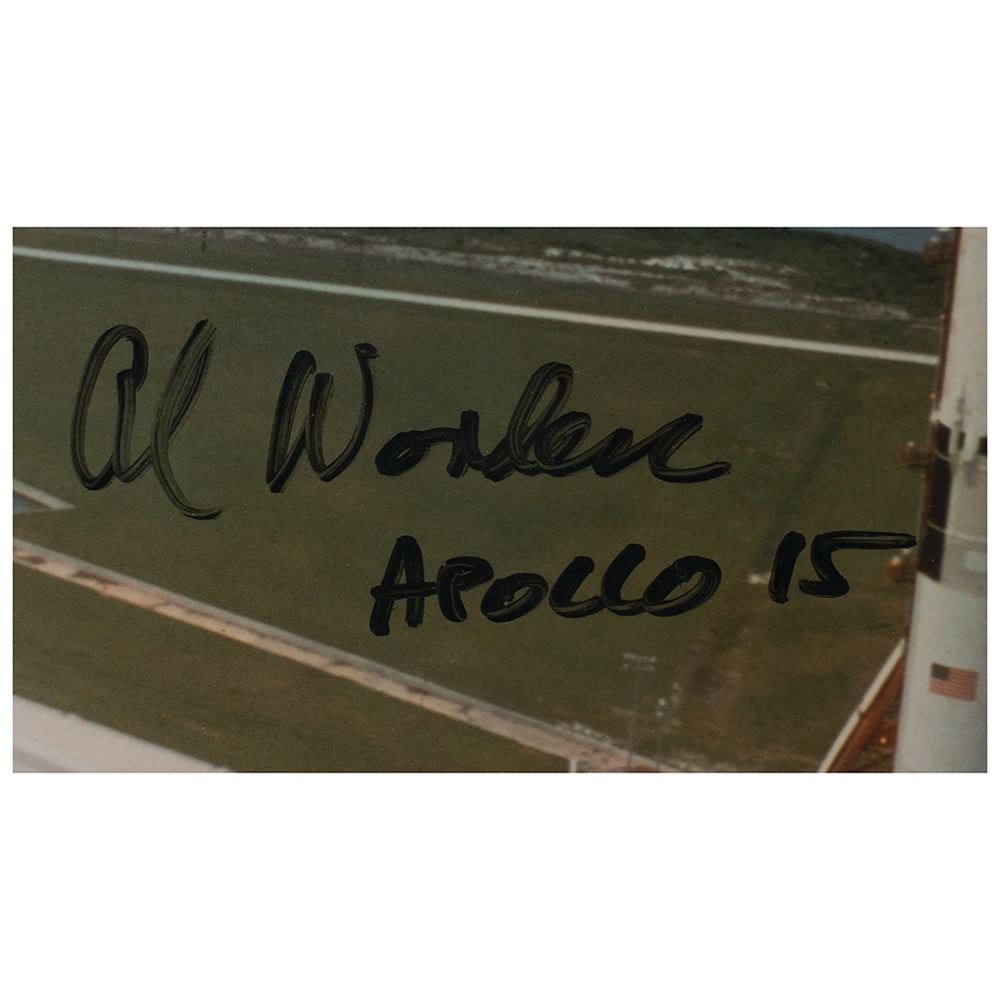 Two oversized signed photographs from Al Worden's personal collection: a color glossy 14 x 11 photo of the Saturn V at Kennedy Space Center, signed in black felt tip, "Al Worden, Apollo 15"; and a color glossy 14 x 11 of Apollo 15 CDR Dave Scott saluting the American flag on the lunar surface, signed in black felt tip "Al Worden, Apollo 15." Individually framed and in overall fine condition, with a few small surface stains to the launch pad photo.