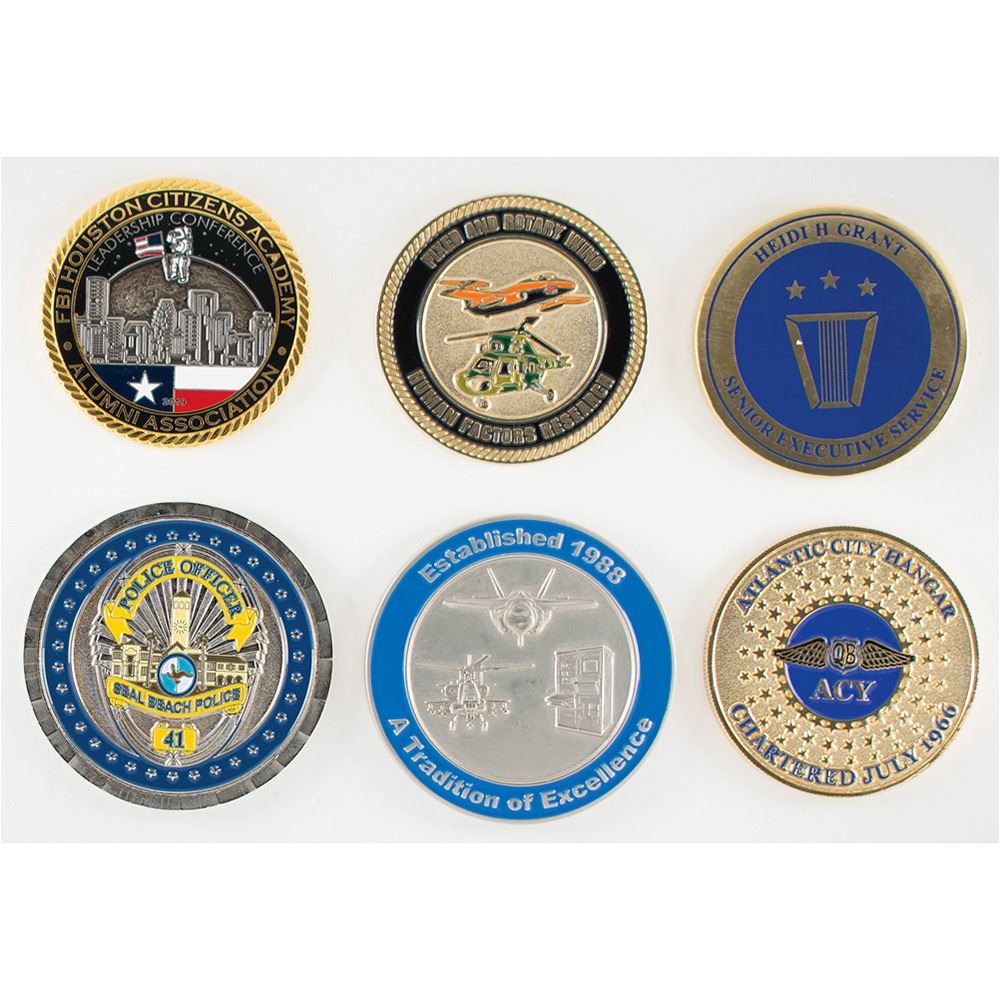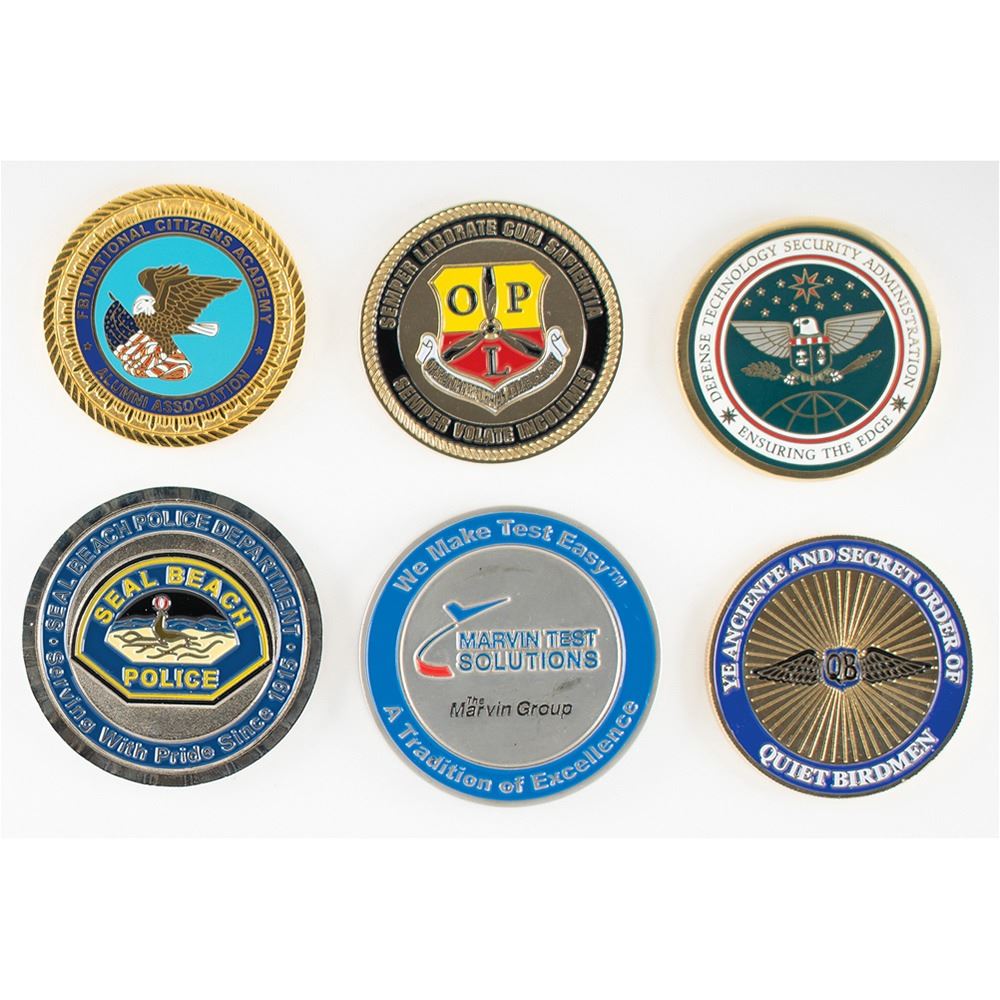 Al Worden's lot of six medallions and 'challenge coins,' each 1.75" or 2" in diameter, with embossed color designs and text to both sides, including: a Defense Technology Security Administration coin; a medallion related to the Atlantic City hangar of "Ye Anciente and Secret Order of Quiet Birdmen"; a "Leadership Conference" medallion from the FBI Houston Citizens Academy Alumni Association; a Seal Beach Police Department coin; a Marvin Test Solutions medallion; and an Operator Performance Laboratory medallion for "Fixed and Rotary Wing, Human Factors Research." In overall fine condition.