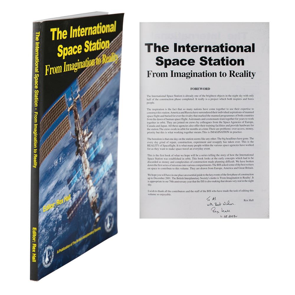 Al Worden's personally-owned signed book: The International Space Station: From Imagination to Reality. Liverpool: British Interplanetary Society, 2002. Softcover, 8.25 x 11.75, 160 pages. Signed and inscribed on the first page in black felt tip by the editor, "To Al, With Best Wishes, Rex Hall, 11.05.2003." In fine condition.