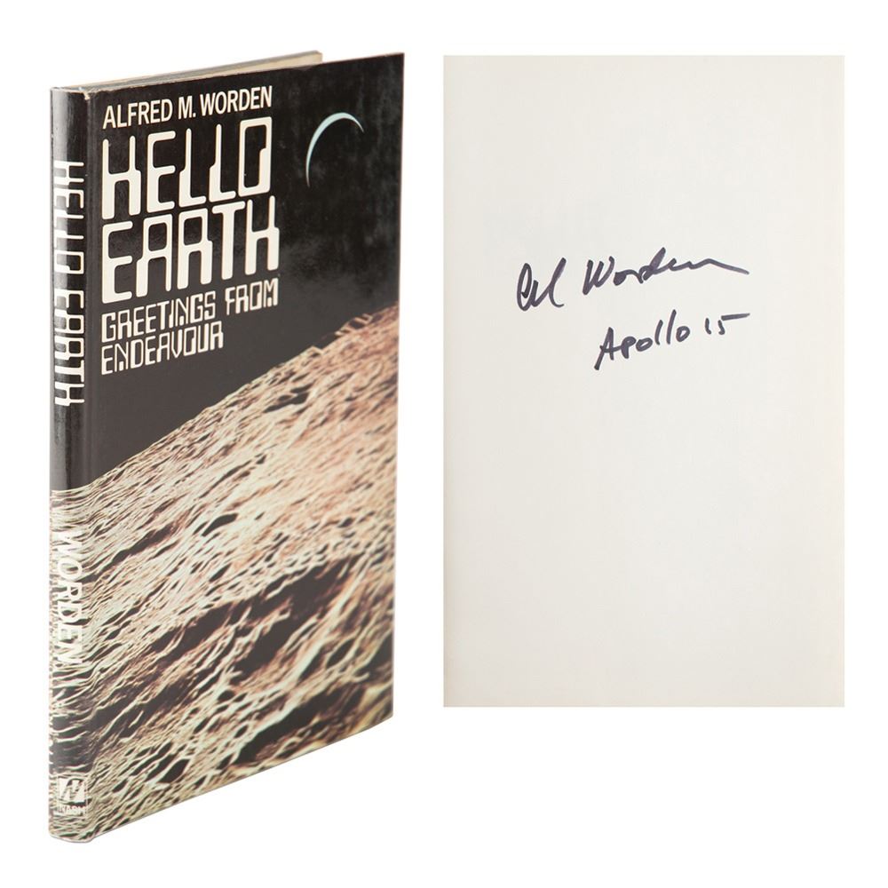 Al Worden's personally-owned signed book: Hello Earth: Greetings from Endeavour. First edition. Los Angeles: Nash Publishing, 1974. Hardcover with dust jacket, 6 x 8.5, 80 pages. Signed on the first free end page in black felt tip, "Al Worden, Apollo 15." In fine condition, with light wear to the dust jacket. A desirable volume of creative poetry written by Worden in response to the practically unfathomable experience of spaceflight.