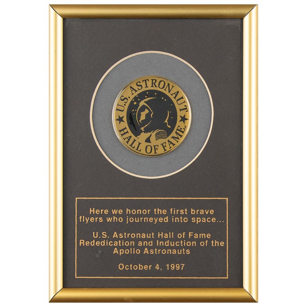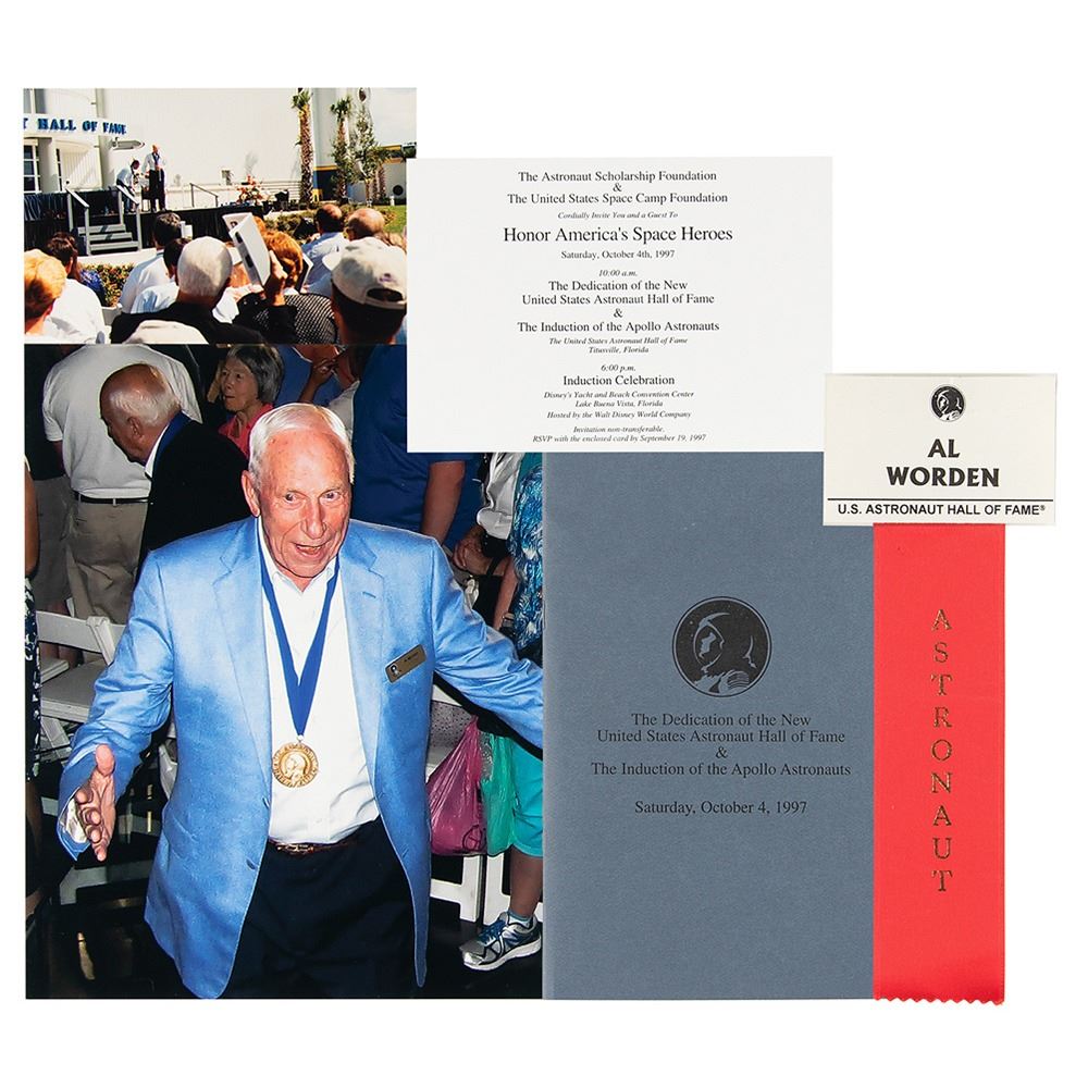 Al Worden's United States Astronaut Hall of Fame plaque presented upon his induction on October 4, 1997, 5.5 x 7.5, featuring a golden "U.S. Astronaut Hall of Fame" medallion with text below: "Here we honor the first brave flyers who journeyed into space‰Û_ U.S. Astronaut Hall of Fame Rededication and Induction of the Apollo Astronauts, October 4, 1997." Includes an "Al Worden, Astronaut" name badge and ribbon from the Hall of Fame, two photos from the event, an original program for the ceremony, and an invitation sent to his daughter. In overall fine condition.